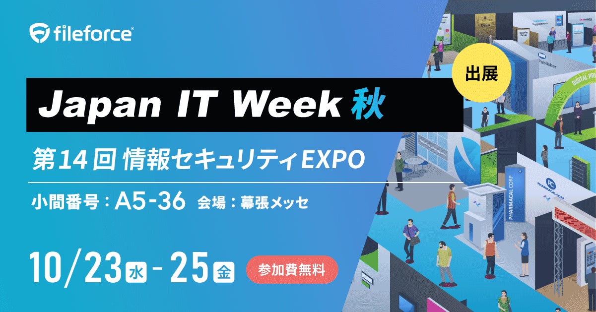 ファイルフォース株式会社は、2024年10月23日(水)~25日(金)に幕張メッセで開催される「Japan IT Week 秋 2024」に出展いたします。当社ブースでは、法人向けクラウドストレージサービス「Fileforce(ファイルフォース)」および、リリース準備中の電子サイン機能、新・AI検索機能の先行展示や、ストレージSaaSとしての快適な操作性もご体験いただけます。