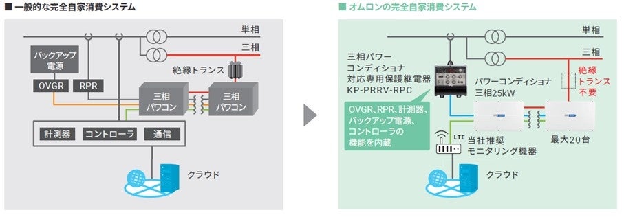 この度OSSは2021年に発売し、ご好評を得ている完全自家消費システム(単相タイプ)に加え、「三相対応」の完全自家消費システムを発売し、従来の低圧発電所から最大500kWまでの中規模太陽光発電所まで、幅広く完全自家消費をサポートします。本システムでは高精度負荷追従機能により、従来10%以上抑制していた発電電力の上限を最大で99%程度(※3)まで高めることが可能となりました。また、専用の保護継電器(※4)に5つの周辺機器の機能を内蔵したことで機器構成数を最小化(※5)し、配線・設定工数などの設置コストの削減に貢献します。