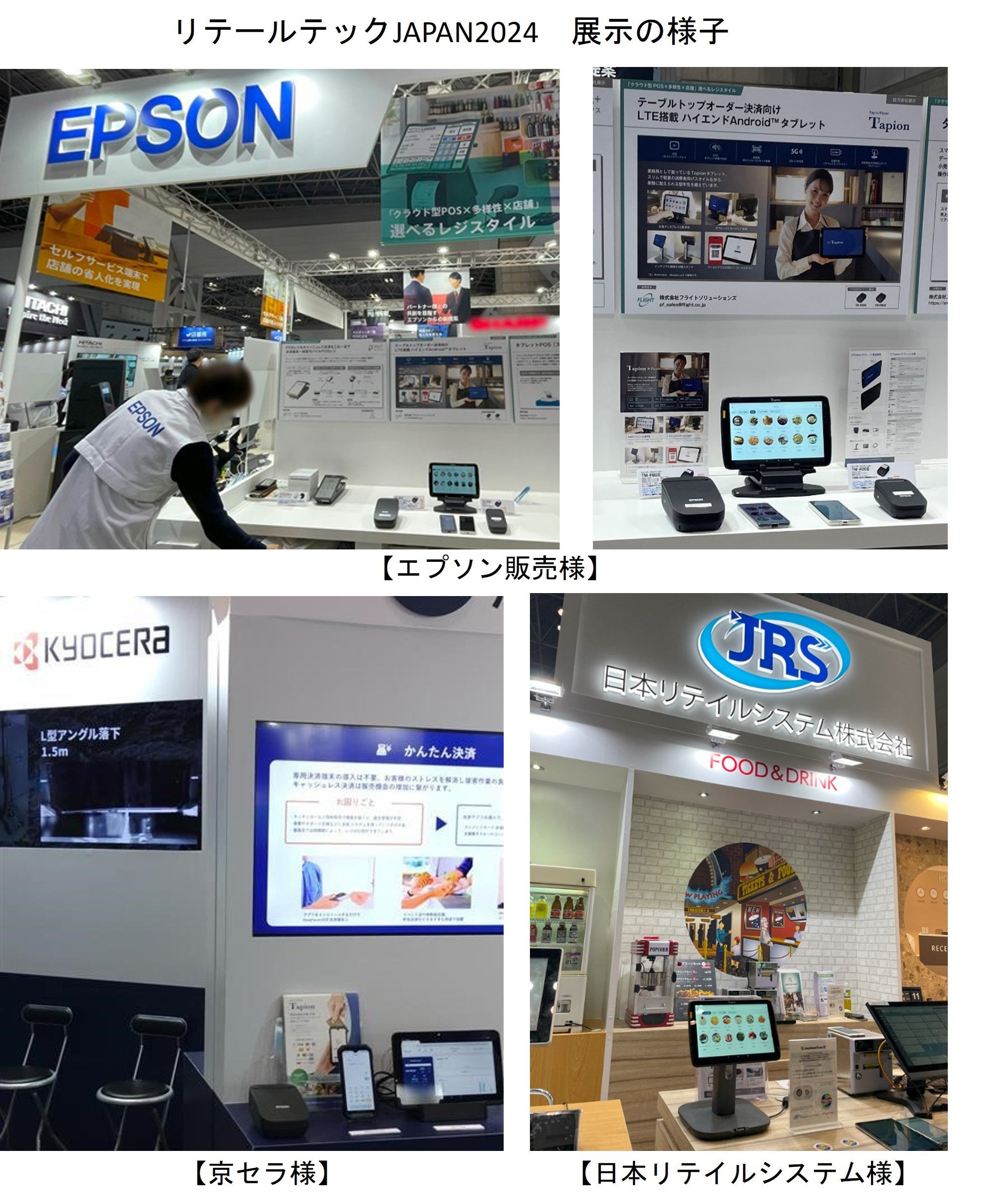 このたびTapionが展示された「リテールテックJAPAN2024」は、2024年3月12日から3月15日の4日間東京ビッグサイトで開催され、累計70,740名が来場しました。Tapionは同イベントに出展したエプソン販売株式会社様、京セラ株式会社様、日本リテイルシステム株式会社様の各ブースに展示されました。飲食店での使用を想定したセルフオーダーからテーブル会計の一連の流れを実演し、決済と連動しているPOS管理画面もご確認いただけるなど、かんたんで速い操作性を体験いただく機会となりました。
