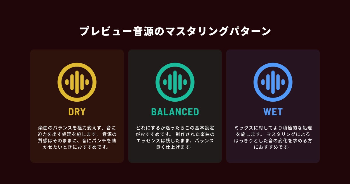 オリジナル音源をアップロードすると、DRY・BALANCED・WETの3パターンのマスタリングプレビューデータが作成され、好みの音源を選択することができます。