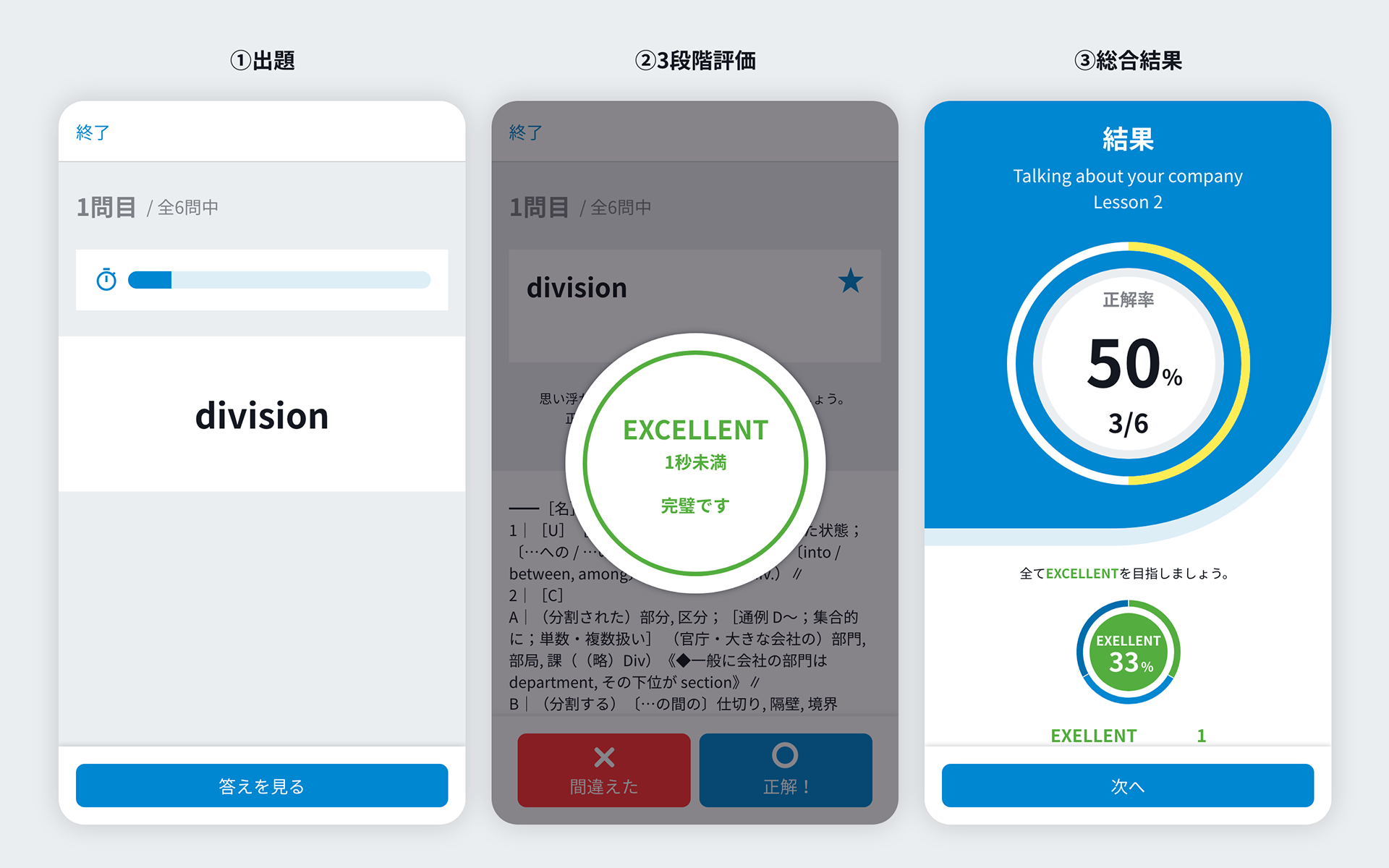 保存した単語から出題される「My単語テスト」と受講生のレベルに応じた単語が網羅的に出題される「実力テスト」に挑戦することができます。テストでは、英単語を見ただけで、瞬間的に意味が頭の中に浮かび上がるかどうかを確認します。回答にかかる時間での3段階評価「EXCELLENT」「GOOD」「NOT BAD」により、単語の定着率を測定することができます。繰り返しテストすることで、反射的に単語の意味を想起できるようになり、実践力を養うことができます。
