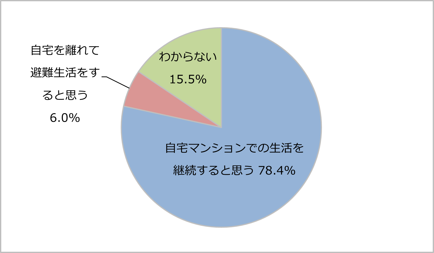 自宅マンションで生活すると思う 78.4% / 自宅を離れて生活すると思う 6.0% / わからない 15.5%
