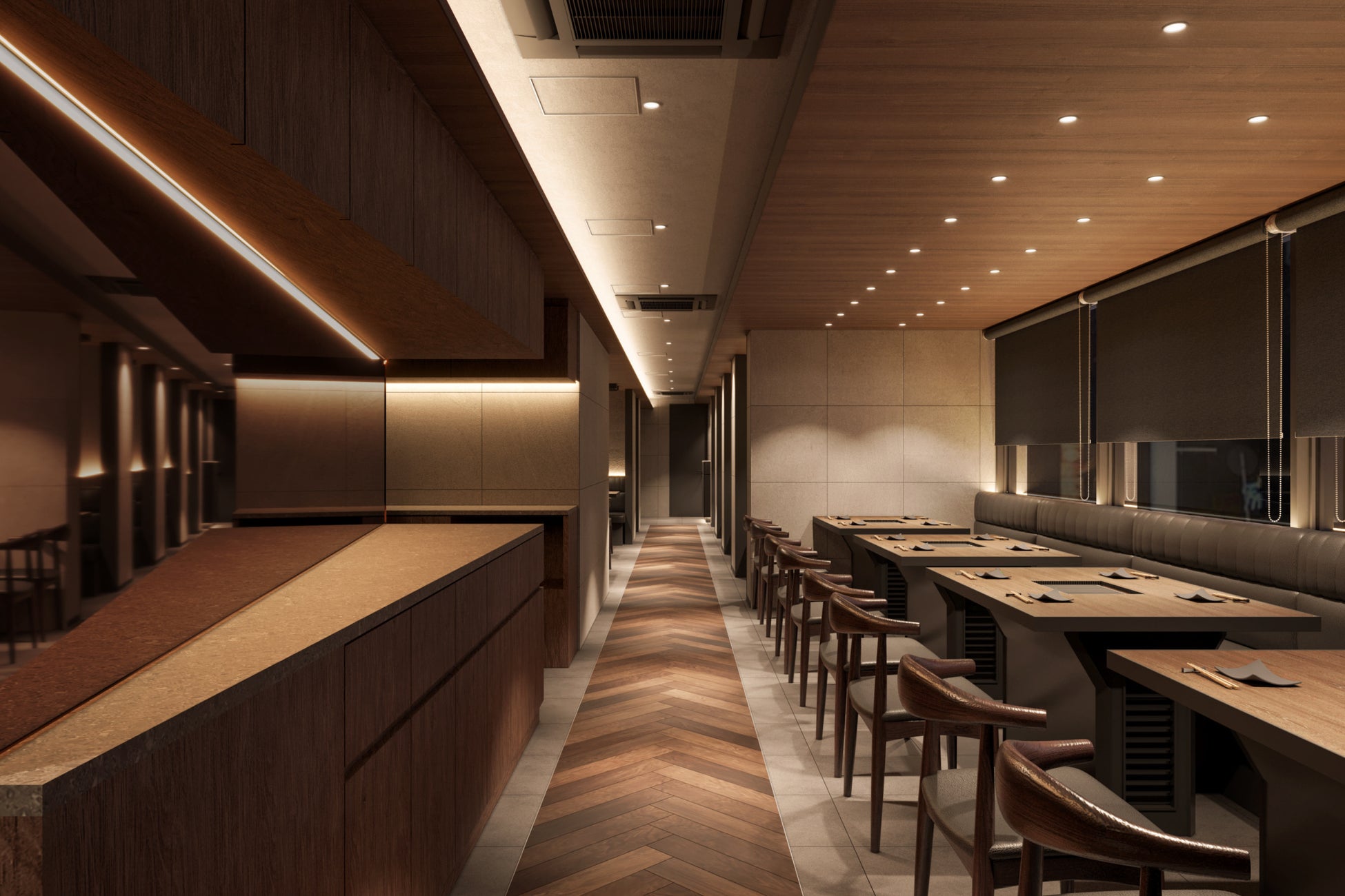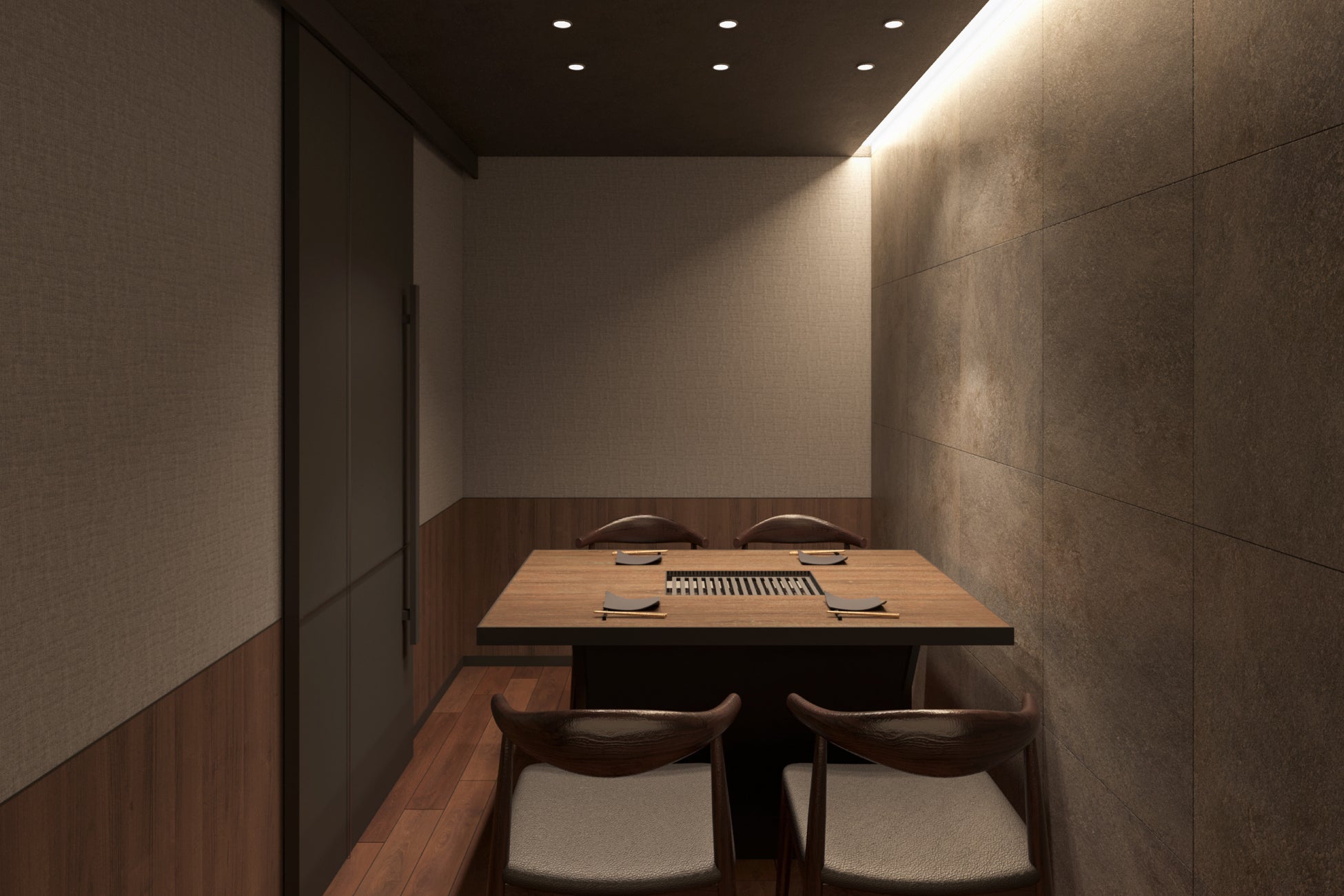 柔らかな光と高級感のあるマテリアルで演出されたエントランス。1階にはプライバシーに配慮した趣のある大小5つの完全個室を備えております。階段の先、2階にはシンプルモダンで統一された開放感のあるダイニングがゲストをお迎えいたします。フロア別に異なる上質な空間を、ご利用シーンに合わせてお楽しみいただけます。