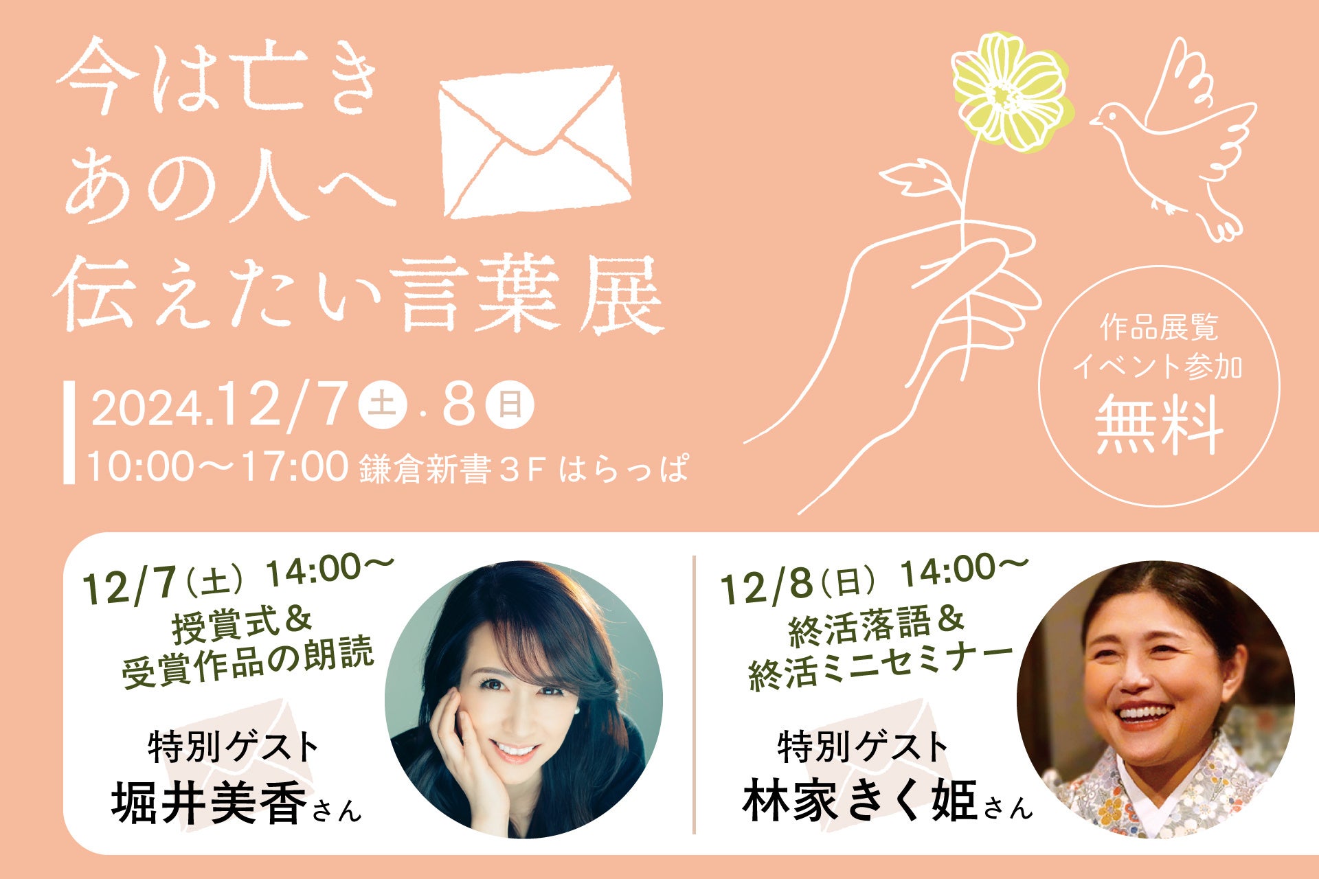 超高齢社会を背景に需要が高まる「終活」に関する多様なサービスを提供する株式会社鎌倉新書(東京都中央区、代表取締役社長:小林史生、東証プライム:6184、以下「当社」)は、2024年12月7日(土)・8日(日)に、第9回「今は亡きあの人へ伝えたい言葉」コンテストを記念した「今は亡きあの人へ伝えたい言葉」展を開催いたします。