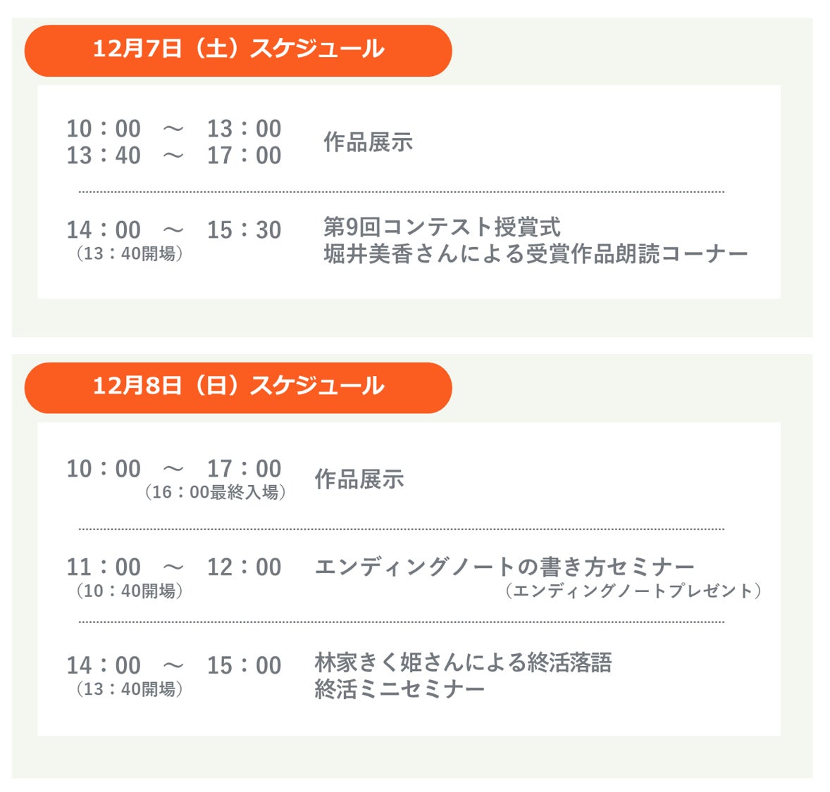 12月7日(土)は第9回コンテストの授賞式と堀井美香さんによる受賞作品の朗読コーナー、8日(日)はエンディングノートの書き方セミナーと落語家の林家きく姫さんによる終活落語を予定