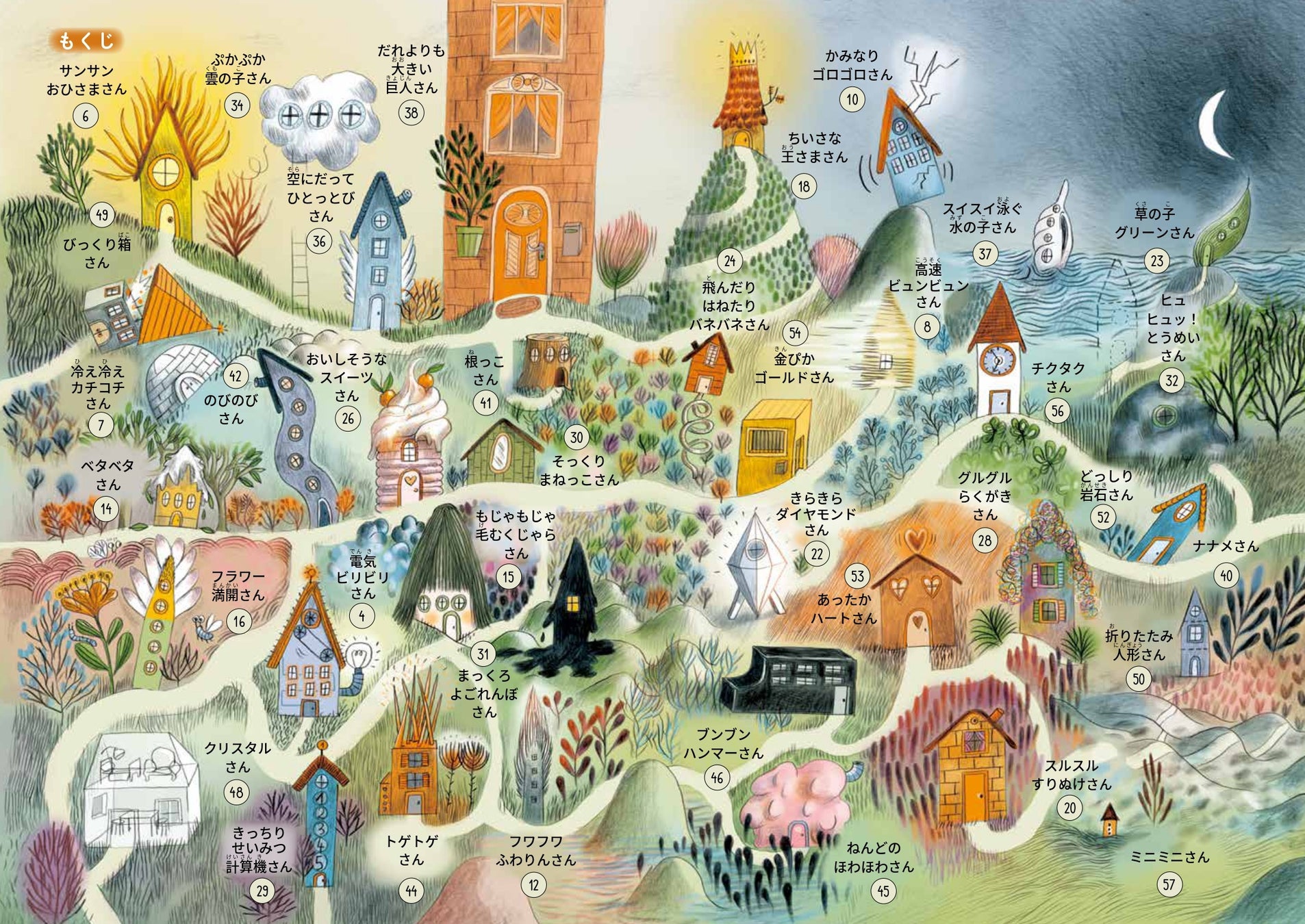 そんなワクワクする出だしからページをめくると、38人の子どもたちが次々に飛び出します。サンサンおひさまさん、飛んだりはねたりバネバネさん、ヒュヒュッ!とうめいさん、まっくろよごれんぼさん、ブンブンハンマーさん……。