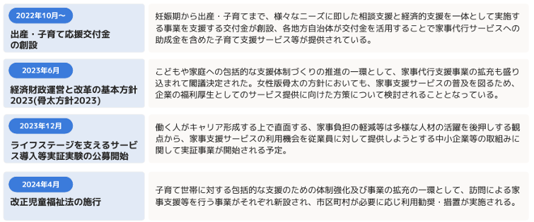 また「2030年までが少子化反転のラストチャンス」とする国の方針に基づき、行政の家事代行支援事業の拡充が実施/計画されています。