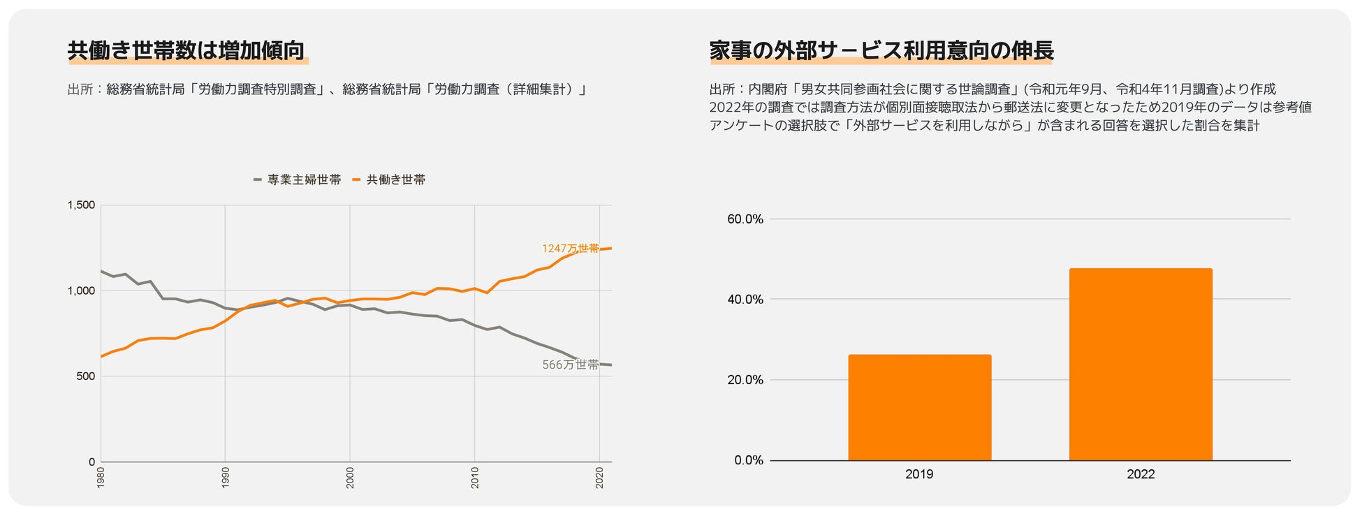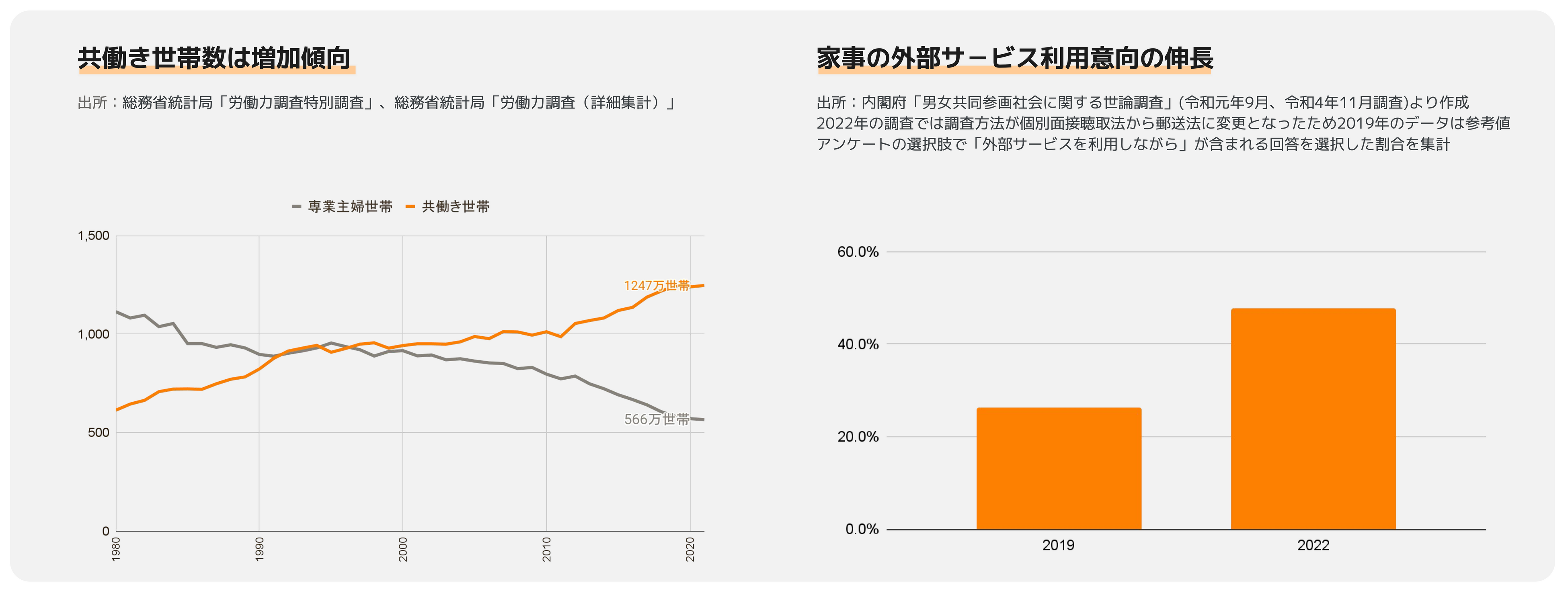 ご夫婦ともにお仕事をしながら家庭と両立する共働き世帯数は、この数十年で専業主婦世帯数の2倍に達し顕著に増加しています。その中で、配偶者との家事分担に対する考え方にも変化がみられ、家事の外部サービスの利用意向も近年で大きく伸長しました。