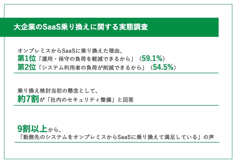 今回の調査では、大企業が勤怠管理システム・労務管理システムをオンプレミスからSaaSへ移行している主な理由は、運用と保守の効率化であることが明らかになりました。多くの担当者が当初は乗り換えに対して懸念を抱いていましたが、実際のところ、SaaSの導入によりこれらの問題が解消され、作業の効率化やセキュリティの向上が実現し、高い満足度を得ています。