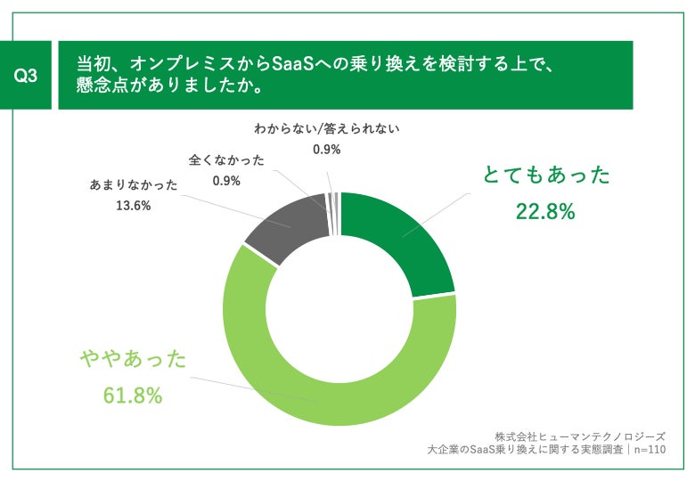「Q3.当初、オンプレミスからSaaSへの乗り換えを検討する上で、懸念点がありましたか。」(n=110)と質問したところ、「とてもあった」が22.8%、「ややあった」が61.8%という回答となりました。