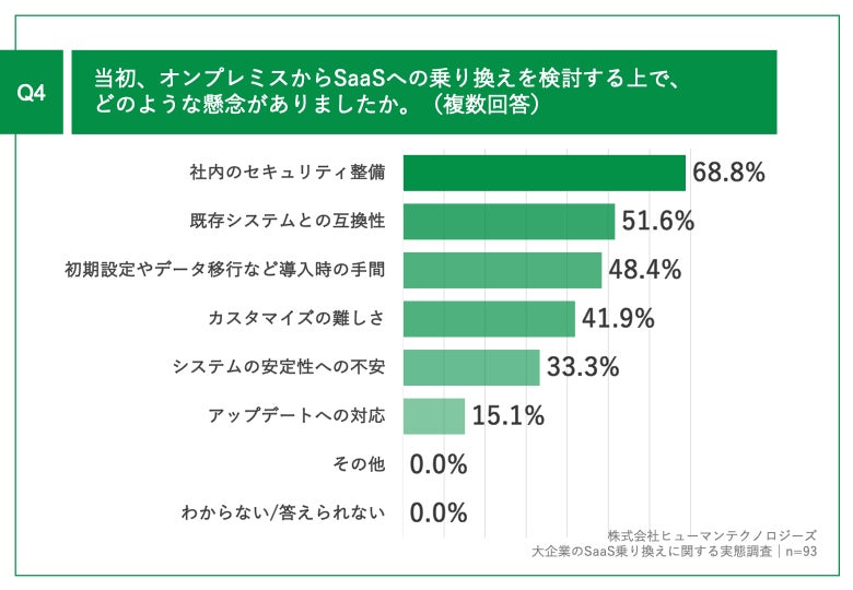 Q3で「とてもあった」「ややあった」と回答した方に、「Q4.当初、オンプレミスからSaaSへの乗り換えを検討する上で、どのような懸念がありましたか。(複数回答)」(n=93)と質問したところ、「社内のセキュリティ整備」が68.8%、「既存システムとの互換性」が51.6%、「初期設定やデータ移行など導入時の手間」が48.4%という回答となりました。