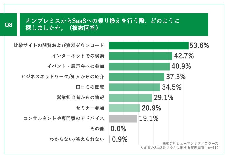 「Q8.オンプレミスからSaaSへの乗り換えを行う際、どのように探しましたか。(複数回答)」(n=110)と質問したところ、「比較サイトの閲覧および資料ダウンロード」が53.6%、「インターネットでの検索」が42.7%、「イベント・展示会への参加」が40.9%という回答となりました。