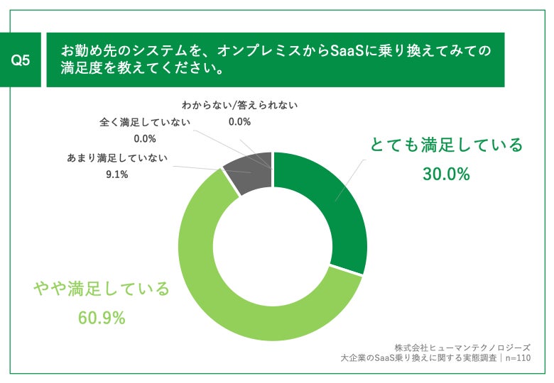 「Q5.お勤め先のシステムを、オンプレミスからSaaSに乗り換えてみての満足度を教えてください。」(n=110)と質問したところ、「とても満足している」が30.0%、「やや満足している」が60.9%という回答となりました。