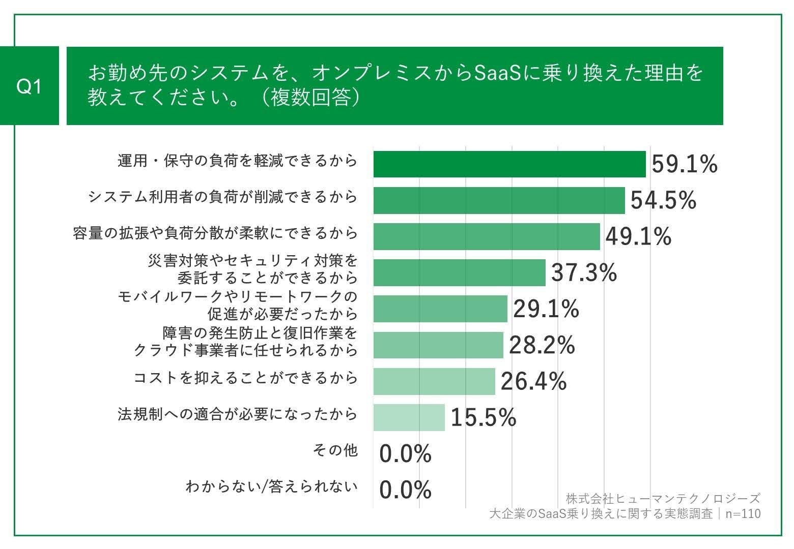 「Q1.お勤め先のシステムを、オンプレミスからSaaSに乗り換えた理由を教えてください。(複数回答)」(n=110)と質問したところ、「運用・保守の負荷を軽減できるから」が59.1%、「システム利用者の負荷が削減できるから」が54.5%、「容量の拡張や負荷分散が柔軟にできるから」が49.1%という回答となりました。