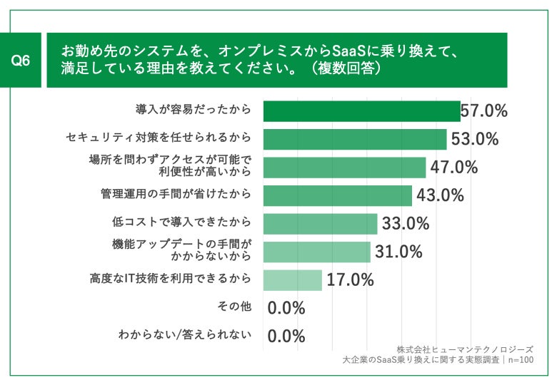 Q5で「とても満足している」「やや満足している」と回答した方に、「Q6.お勤め先のシステムを、オンプレミスからSaaSに乗り換えて、満足している理由を教えてください。(複数回答)」(n=100)と質問したところ、「導入が容易だったから」が57.0%、「セキュリティ対策を任せられるから」が53.0%、「場所を問わずアクセスが可能で利便性が高いから」が47.0%という回答となりました。