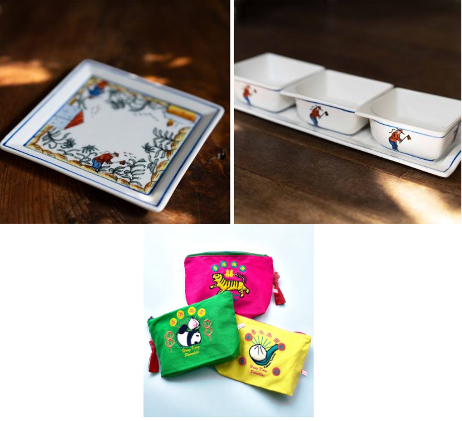香港食器セット:スクエアボウル3つとトレイのセット、スクエアプレート2枚、刺繍ポーチ