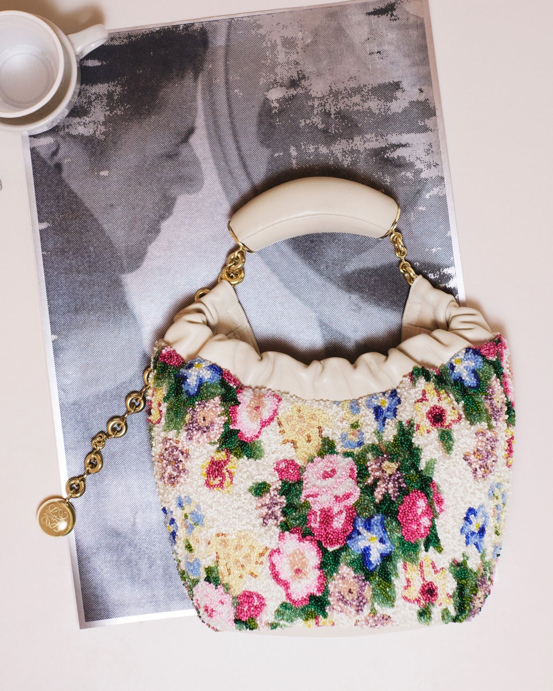 人物描写の率直な手法は、静物写真でも踏襲されています。刺繍が施されたスクイーズバッグ、柔らかなナパレザーのフラメンコパース、そしてカンポ バイカーブーツはまるでカタログ写真のように真上から撮影されています。それぞれのアイテムはデヴィッド・シムズのカラープリントの上に置かれ、まわりの石や植物などが謎めいた雰囲気を深めています。