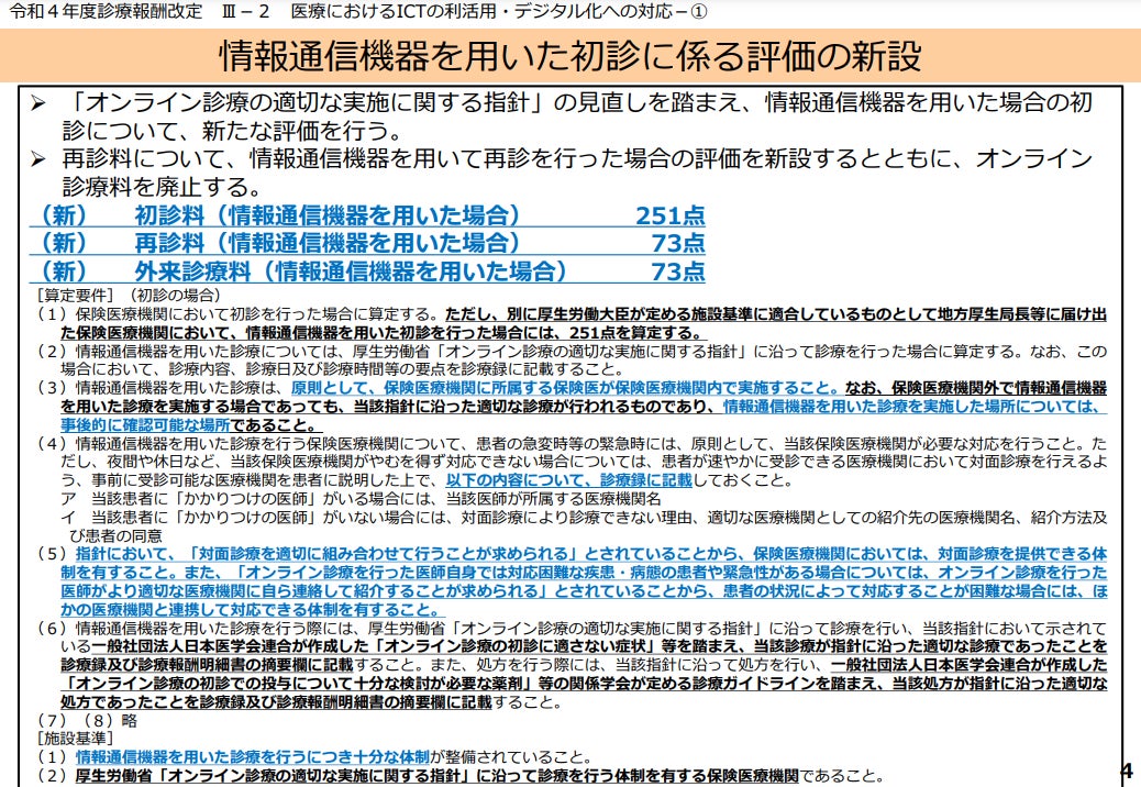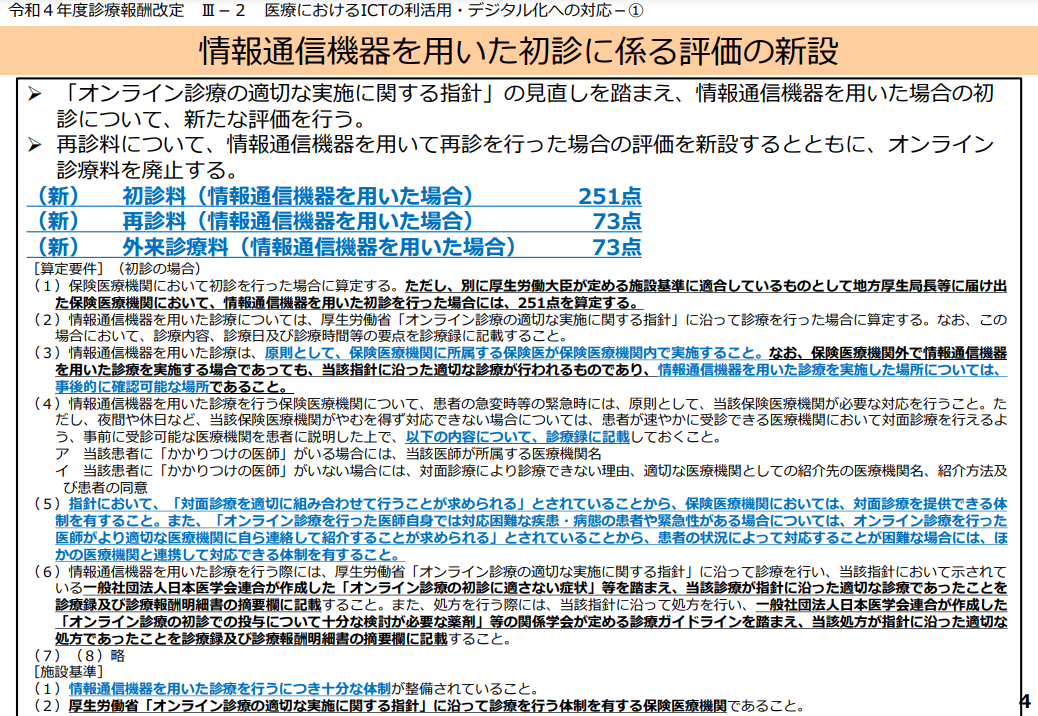 その一環として、従来の「オンライン診療料」では再診以降の算定しか認められていませんでしたが、今回の改定で、初診から算定できるようになりました。