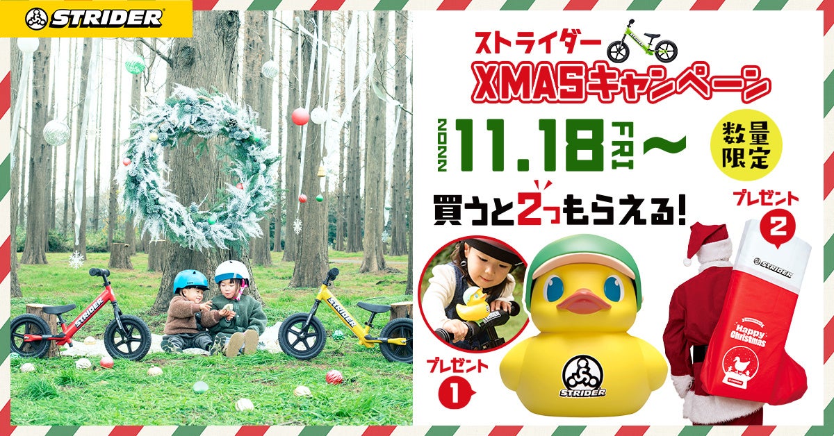対象のストライダーをご購入いただいた方へ、ダッくんダックとサンタブーツの両方がもらえるキャンペーンを開催いたします。数量限定、無くなり次第終了。全国のサンタさん、お早めにお求めください!