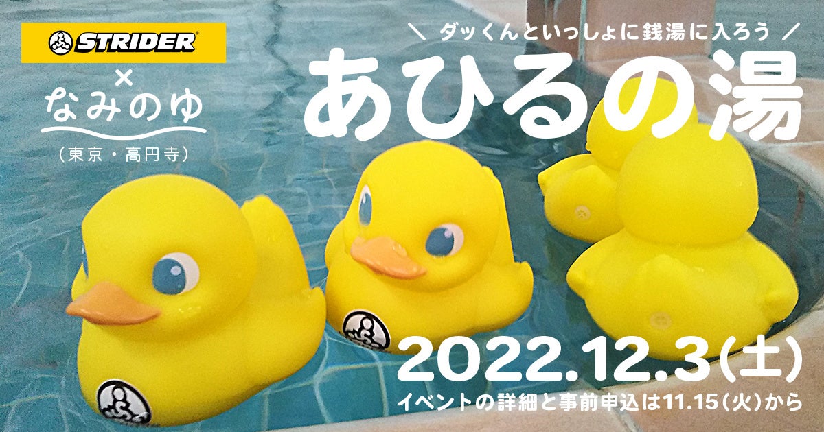株式会社Ampus(本社:東京都杉並区、代表取締役:岡島和嗣)が運営するストライダージャパンは、2022年12月3日(土)「あひるの湯」を一日限定オープンします。