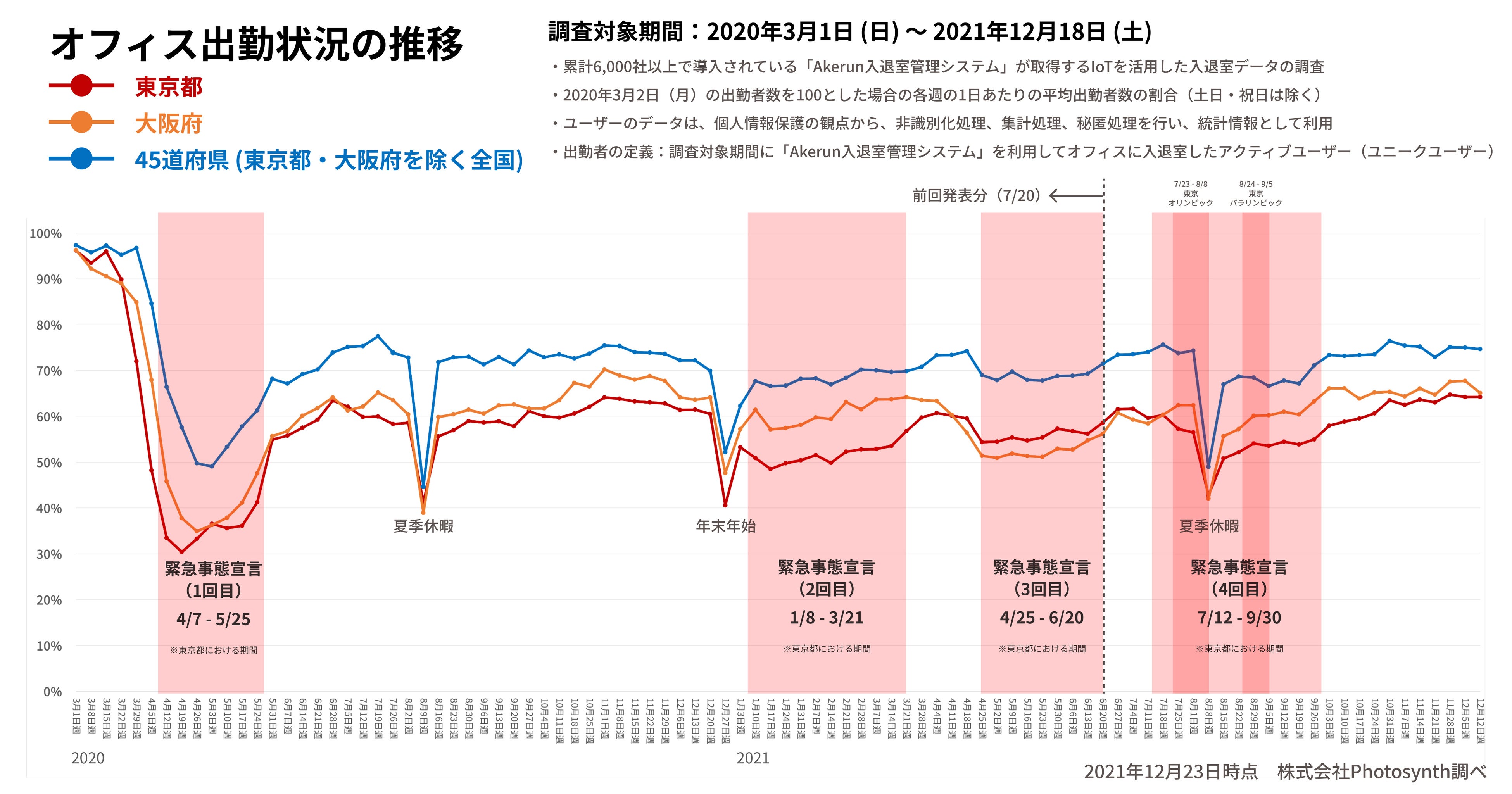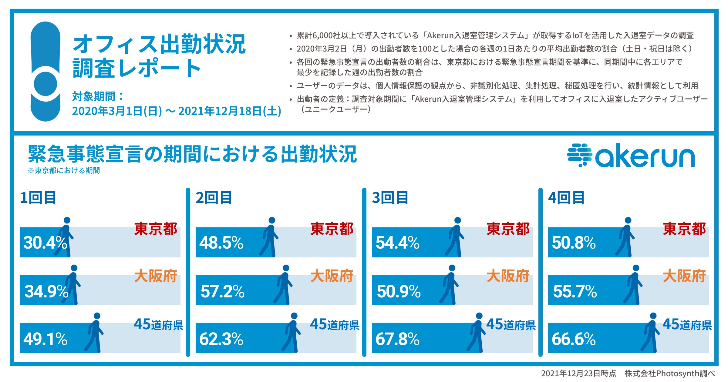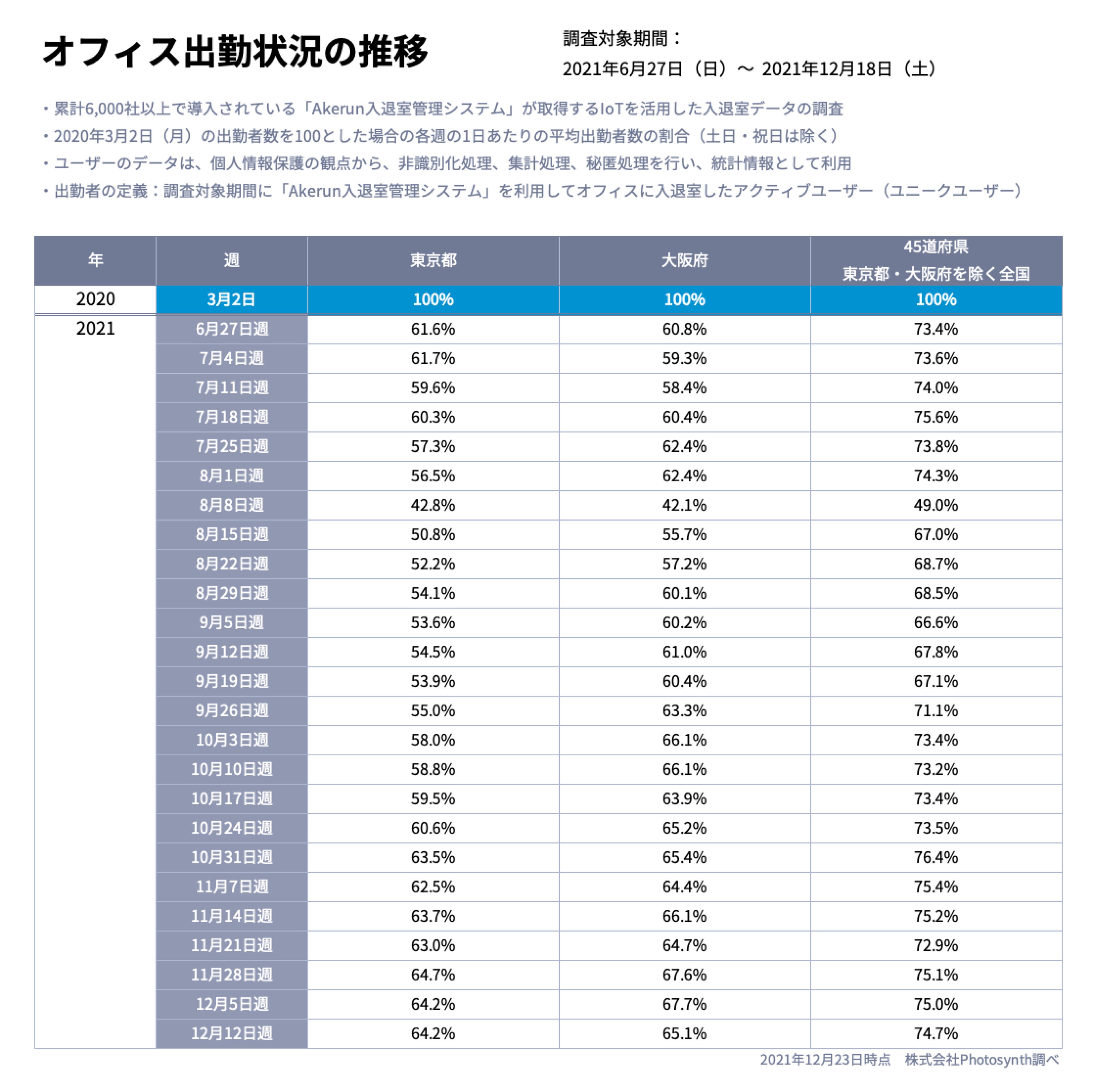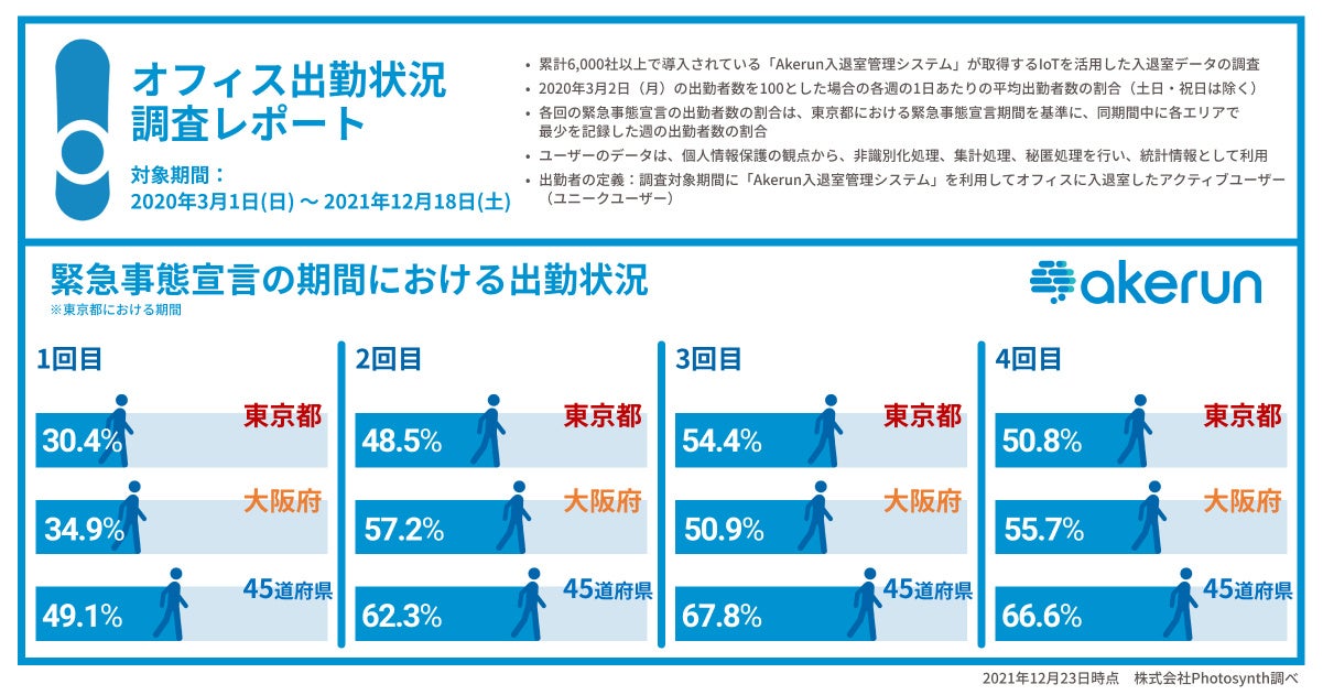 株式会社Photosynth(東京都港区、代表取締役社長 河瀬航大、以下フォトシンス)は、全国の累計6,000社以上で導入されている「Akerun入退室管理システム」のIoTデータを活用し、新型コロナウイルス感染症(COVID-19)の影響拡大に伴う日本政府による緊急事態宣などを経たオフィス出勤者数の推移に関する調査結果の更新版を発表しました。