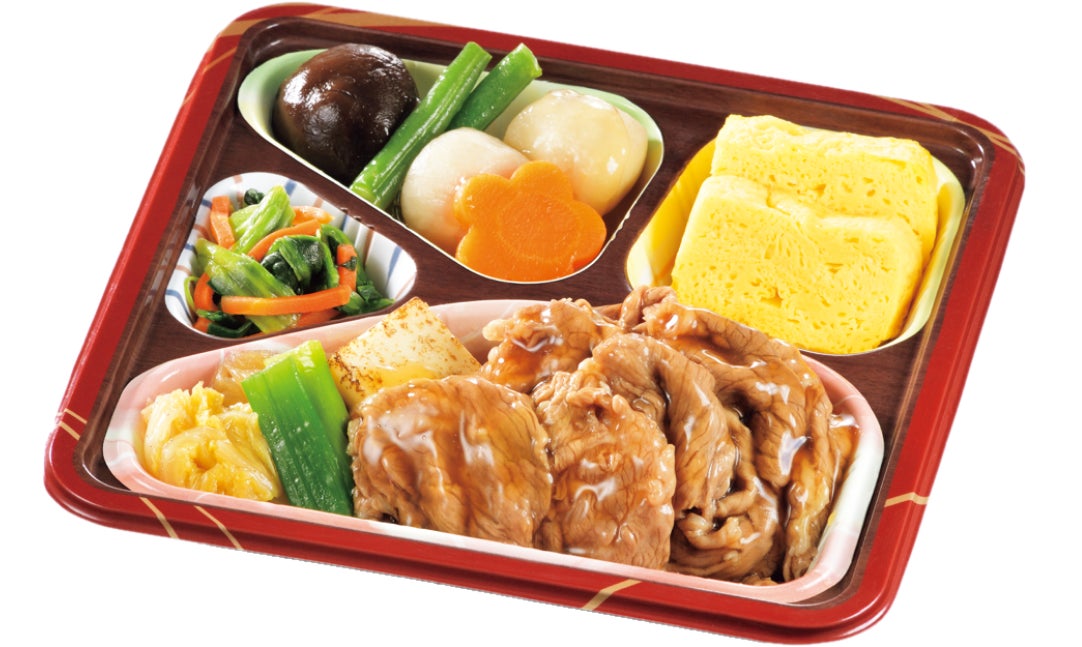 牛すき焼き風は、牛肉が1.3倍に増量しています。また、副菜をすき焼きと相性の良い卵焼きに変更いたしました。