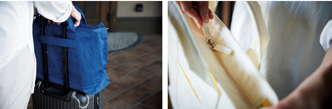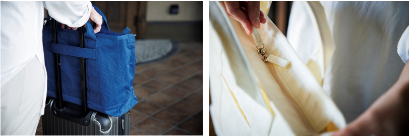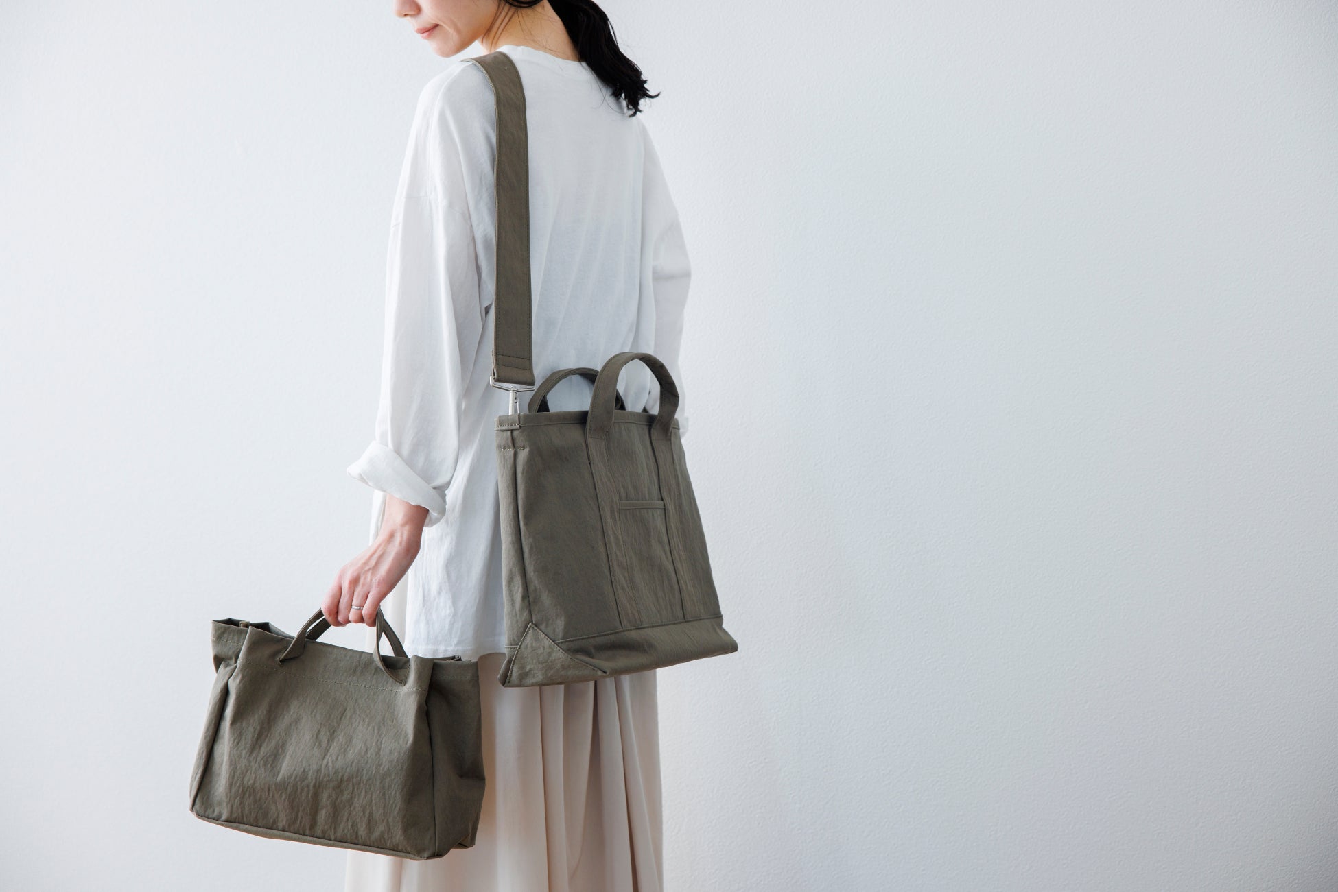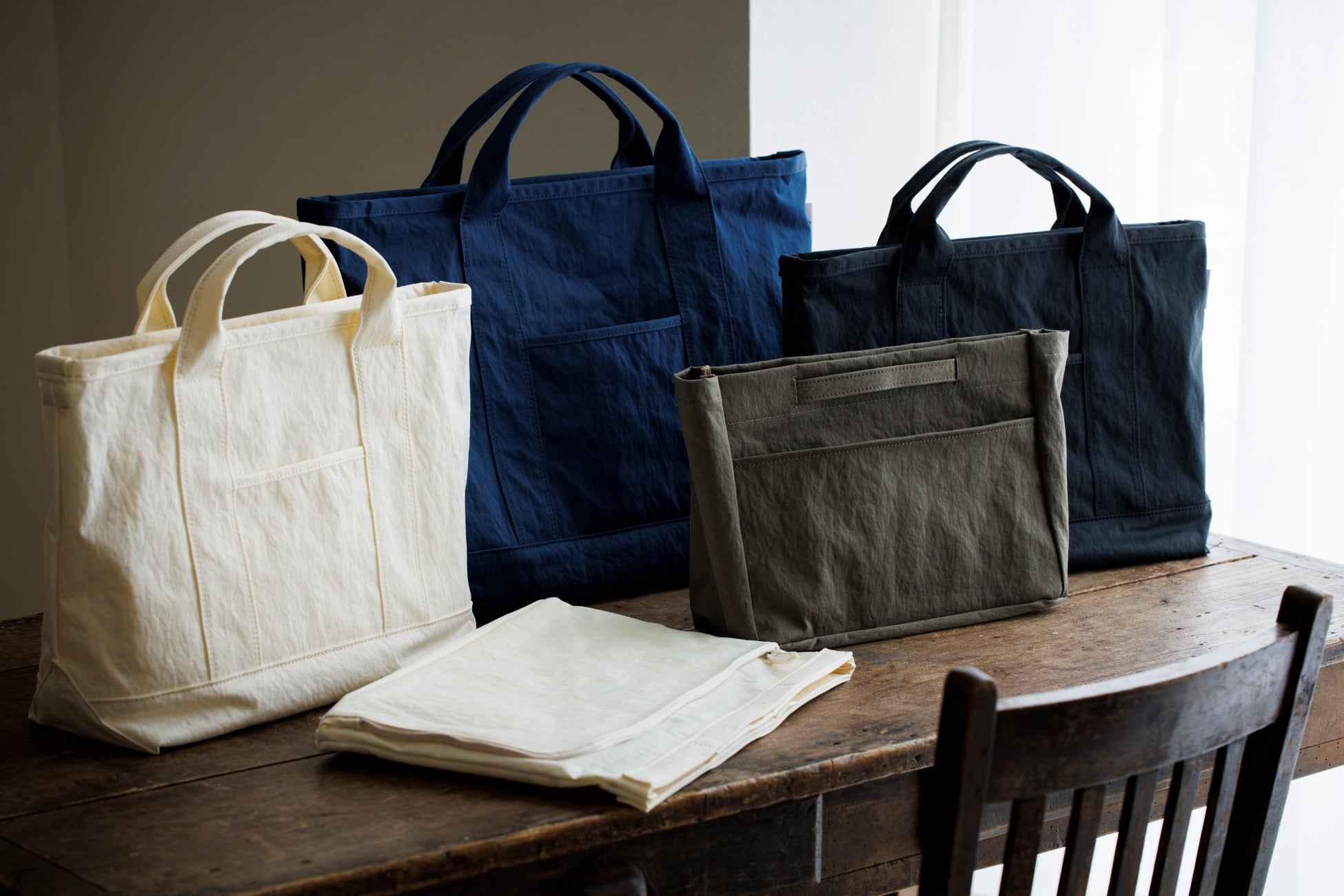トートバッグは、キャリーオン対応のベルトや取り外し可能な底板を搭載。ファスナーはコイルタイプのダブルファスナーに変更し、開閉がよりスムーズになりました。シンプルでミニマルなデザインにこだわりながらも、より使いやすく生活に寄り添ったトートバッグに仕上がりました。