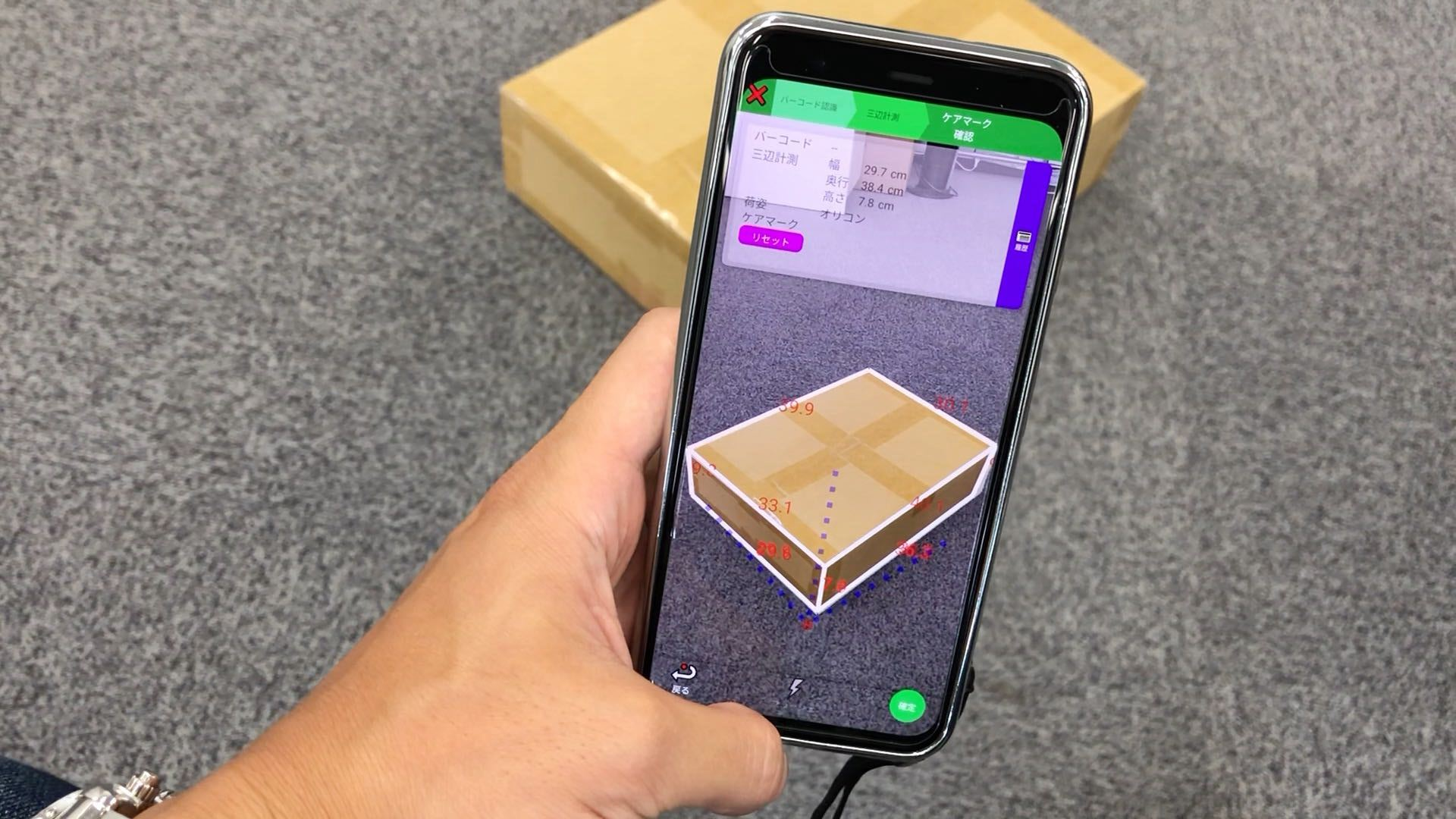「logi-measure」は、 物流作業で自動化・省力化が期待される荷物のサイズ測定やバーコードやケアマークの読取をスマートフォンで荷物を撮影することで実現するスマホアプリケーションです。