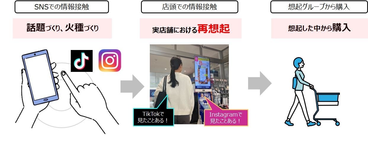 昨今、売上の最大化のためにSNSでの認知~興味喚起施策は当たり前となり、SNSから購入へより一層つなげるためには購入前の店舗で「TikTokで見たことある!」「Instagramで見たことある!」などのように再想起させることが重要となります。