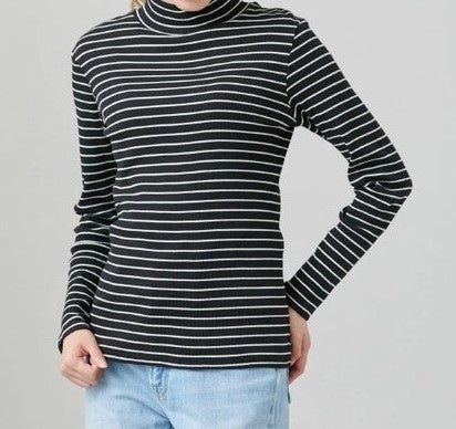 綿100%あったかリブカットソー・ハイネック長袖レディース(ブラック系ボーダー)1,590円