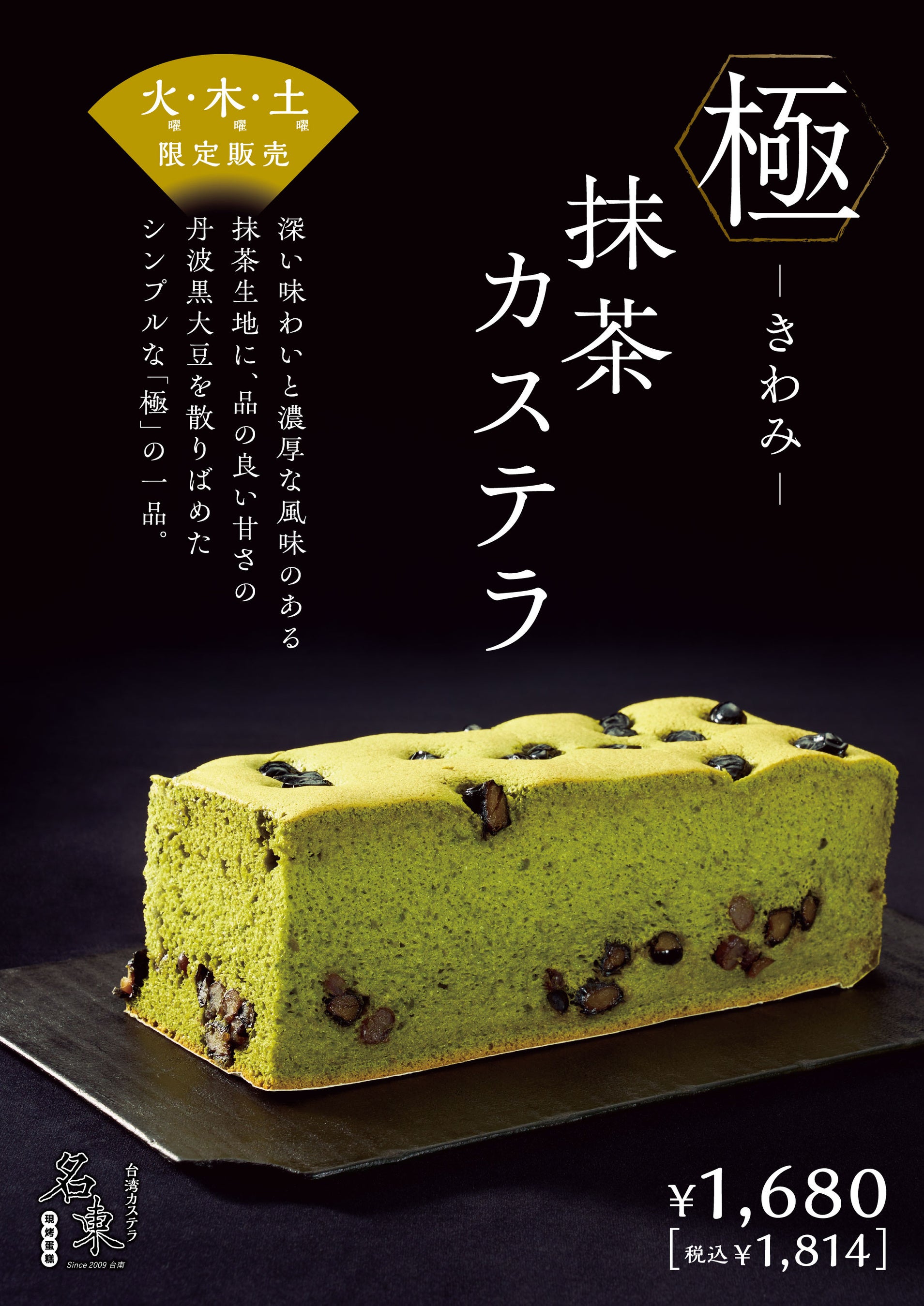 深い味わいと濃厚な風味のある抹茶生地に品の良い甘さの丹波黒大豆を散りばめた、シンプルな「極」の一品。口いっぱいに広がる抹茶の風味を存分にお楽しみください。