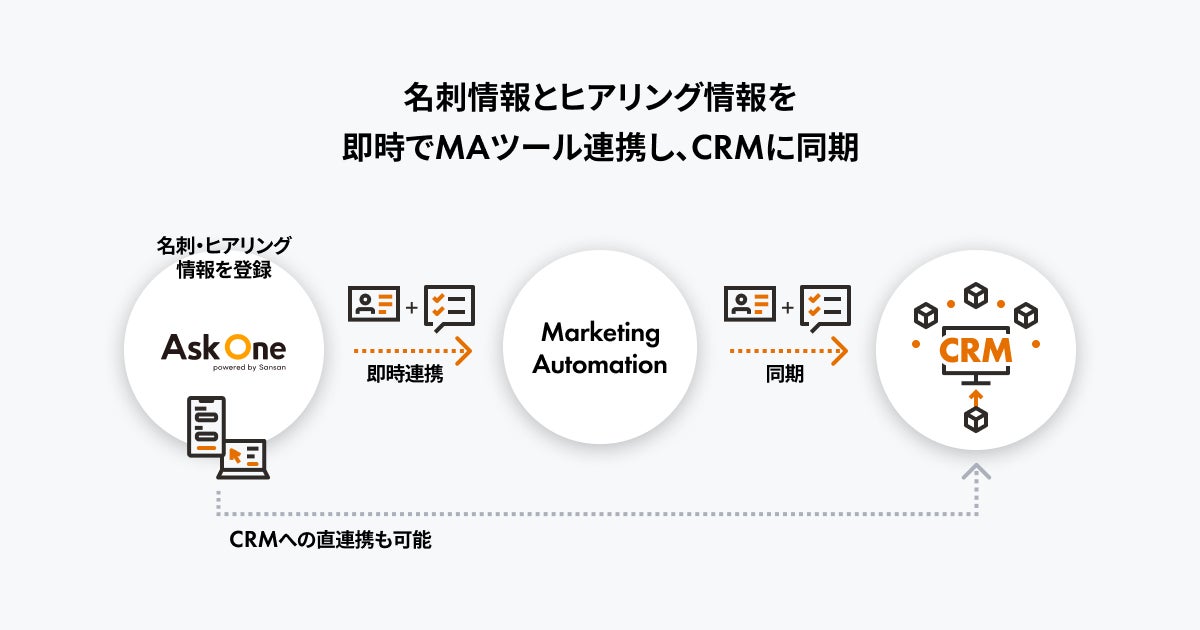 Ask Oneは、取得した名刺情報やヒアリング情報からMQL判定ロジックをフォームに組み込むことができます。また、各種MAツールやCRMとの連携にも対応しているため、従来発生していたデータの手動確認作業を自動化し、リアルタイムに名刺とヒアリング情報をCRMに連携・同期できるようにすることで、社内工数削減と顧客フォローのリードタイム短縮を実現します。