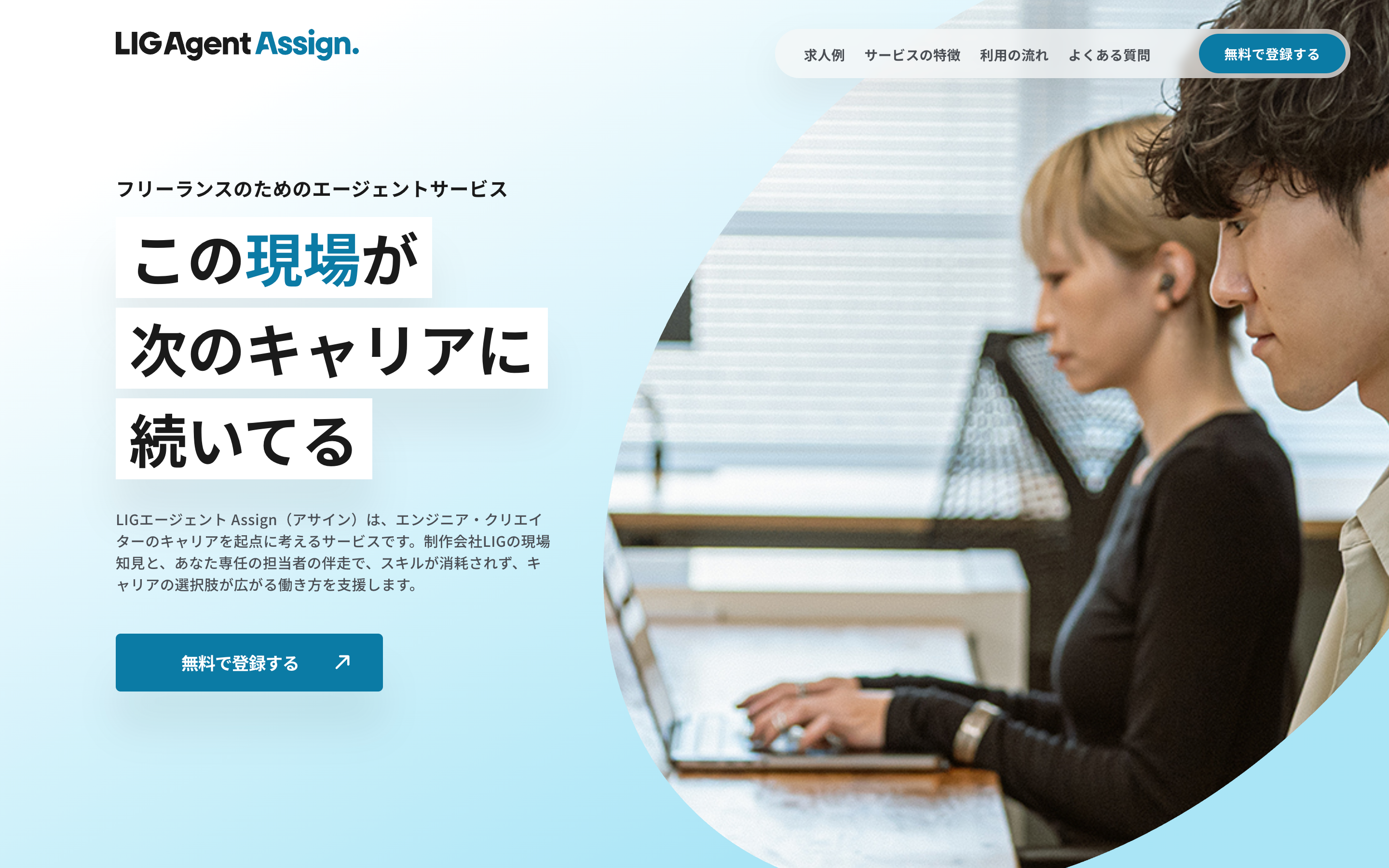 株式会社LIG(本社:東京都台東区、代表取締役社長:大山 智弘)は、2026年3月、フリーランスのクリエイター・エンジニアに特化したエージェントサービス「LIG Agent Assign(リグエージェント アサイン)」をリリースしました。