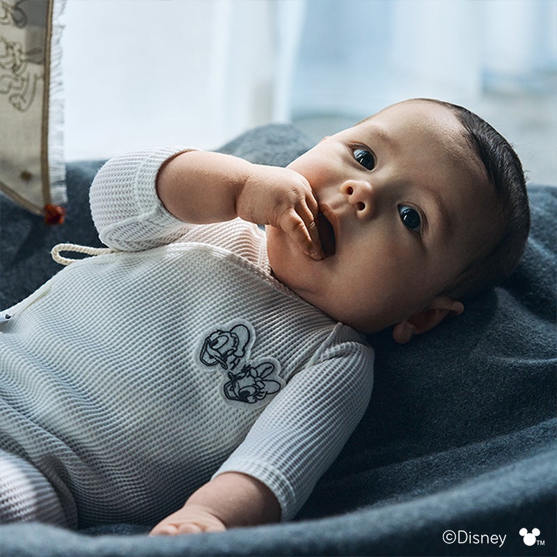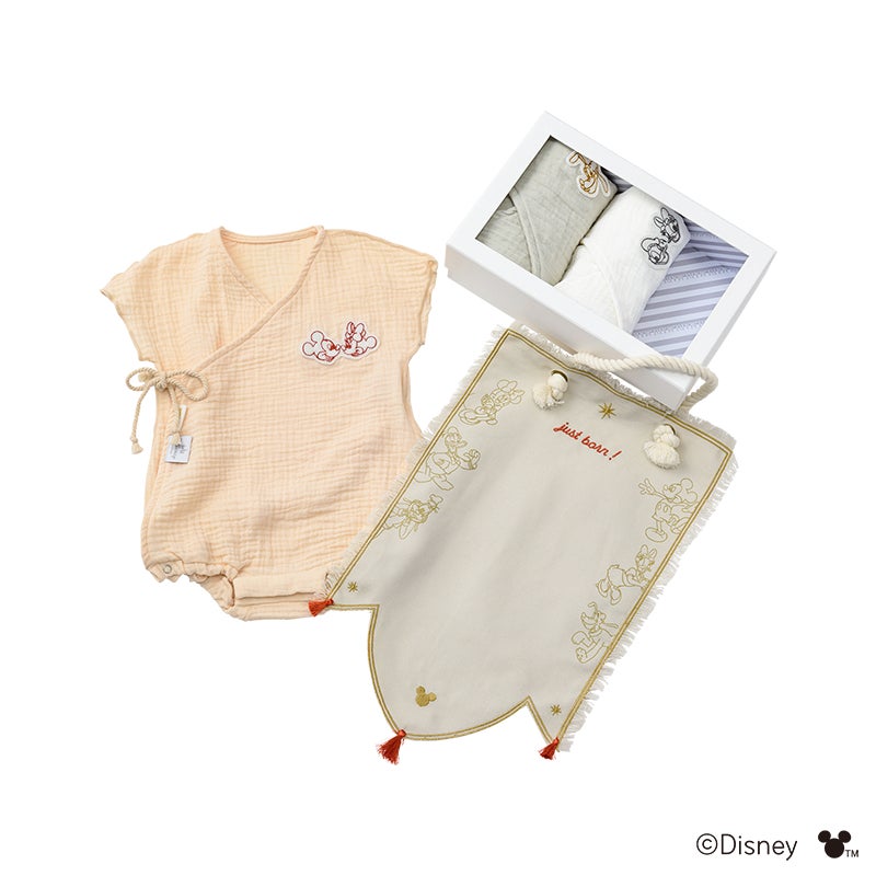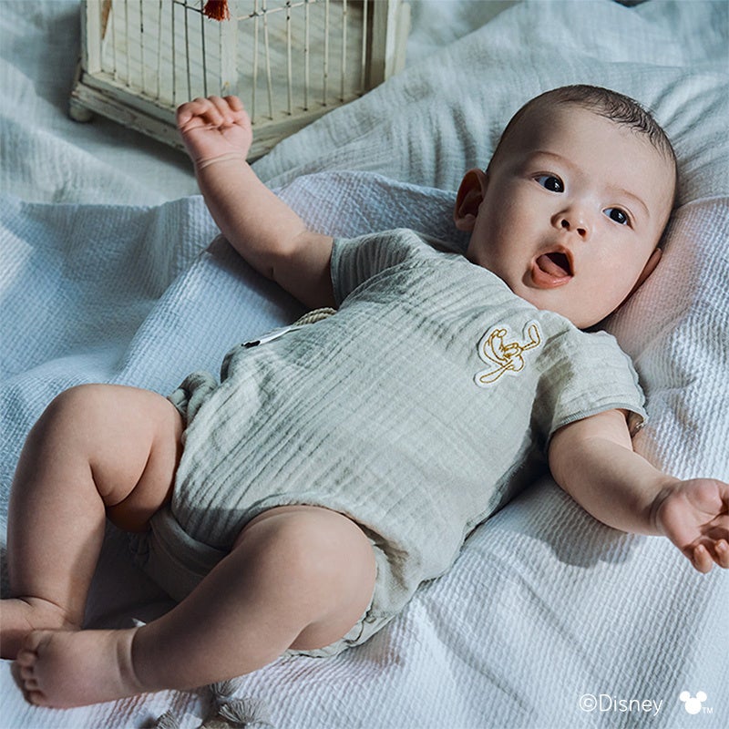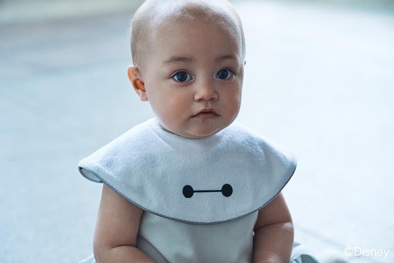ベビーの顔を彩るディズニーのキャラクターたち。名前の刺しゅうを添えて、世界に一つの物語を紡ぎます。