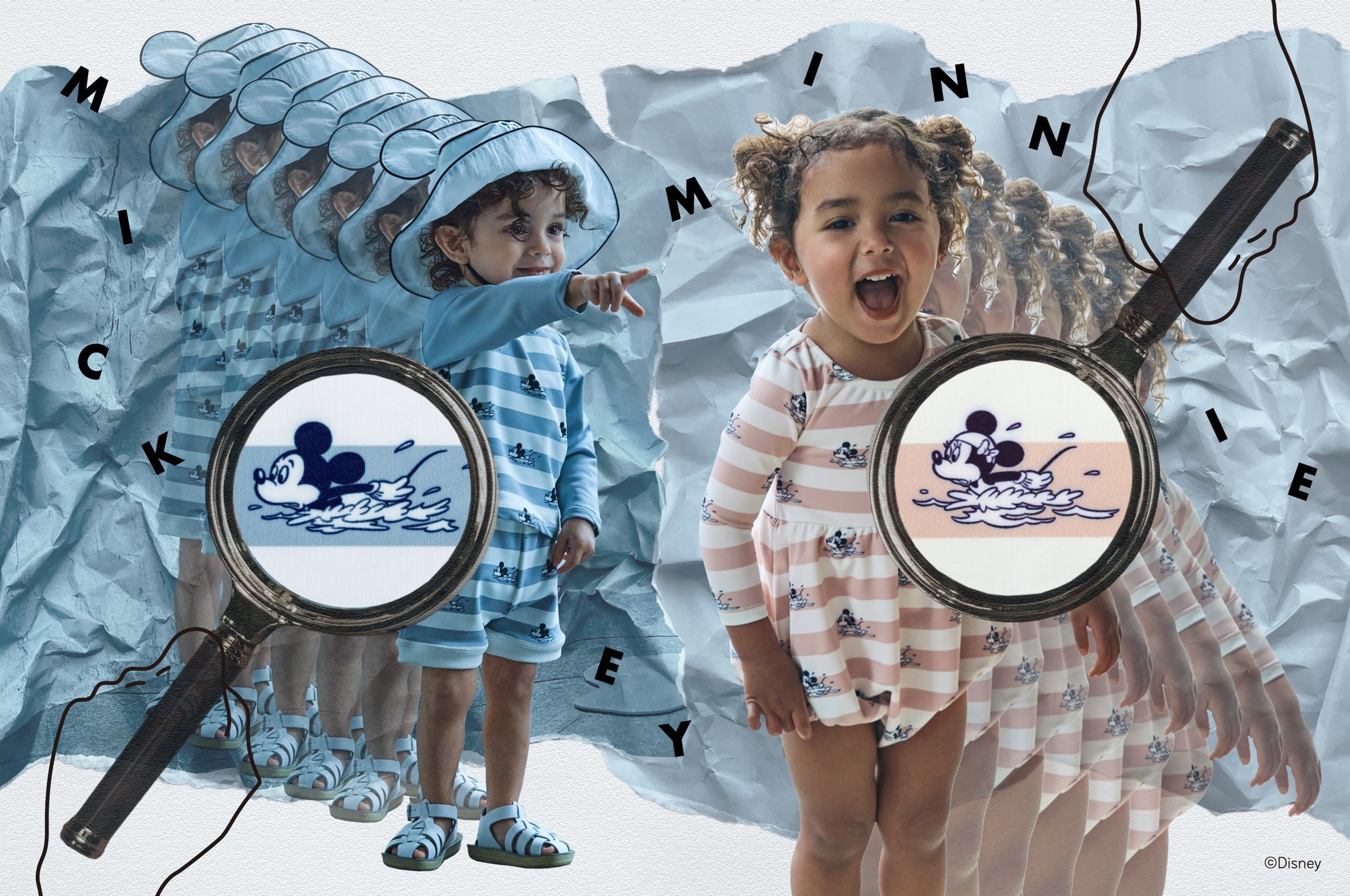 夏らしいマリンボーダーを泳ぐミッキー&ミニーがチャーミング!80cm/100cm/120cmの展開で、きょうだいとのリンクも楽しめます。
