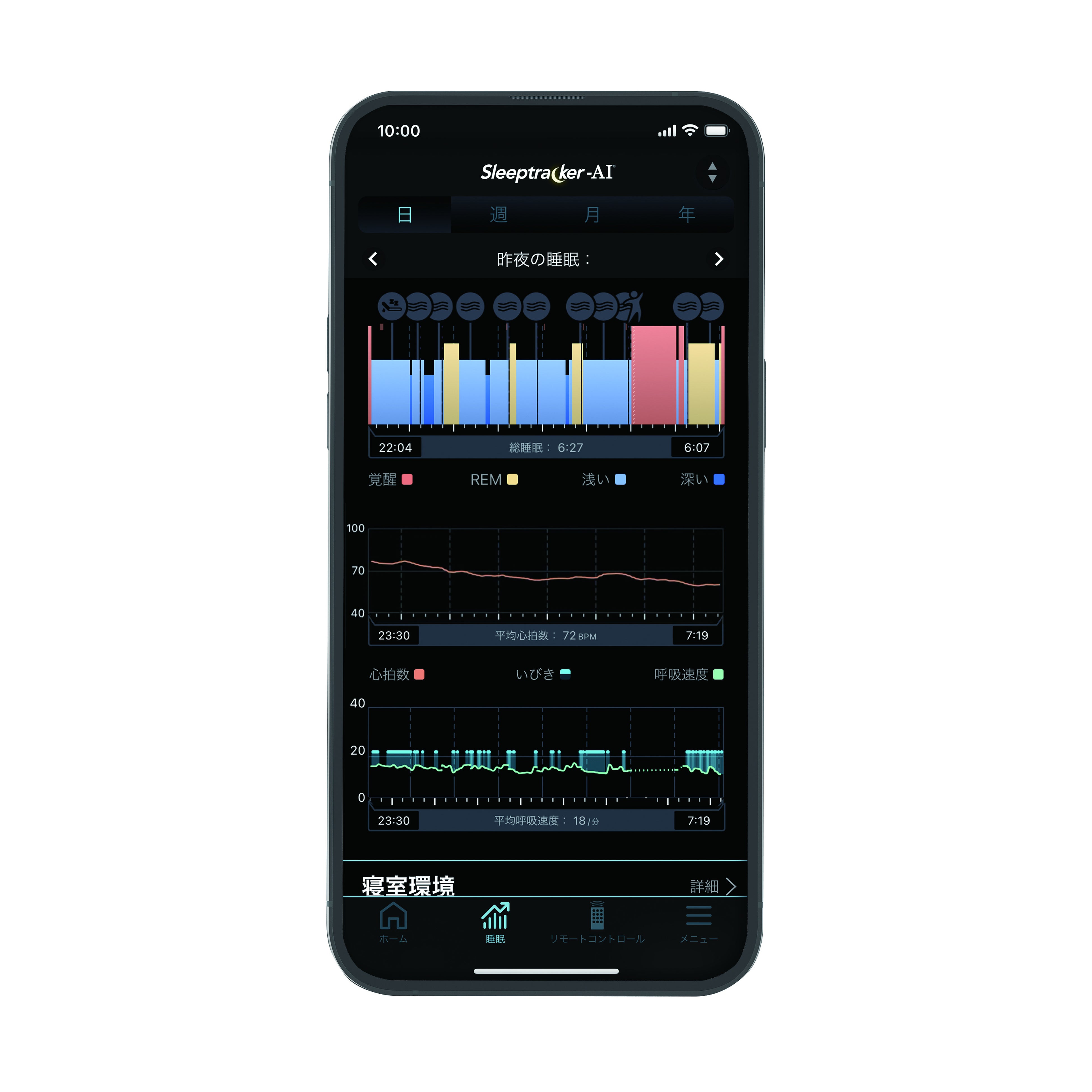 睡眠レポート:毎朝、睡眠レポートが表示。浅い眠り、深い眠り、レム睡眠と覚醒時間を確認できます。心拍数や呼吸数がどのように変化したかも知ることができます。