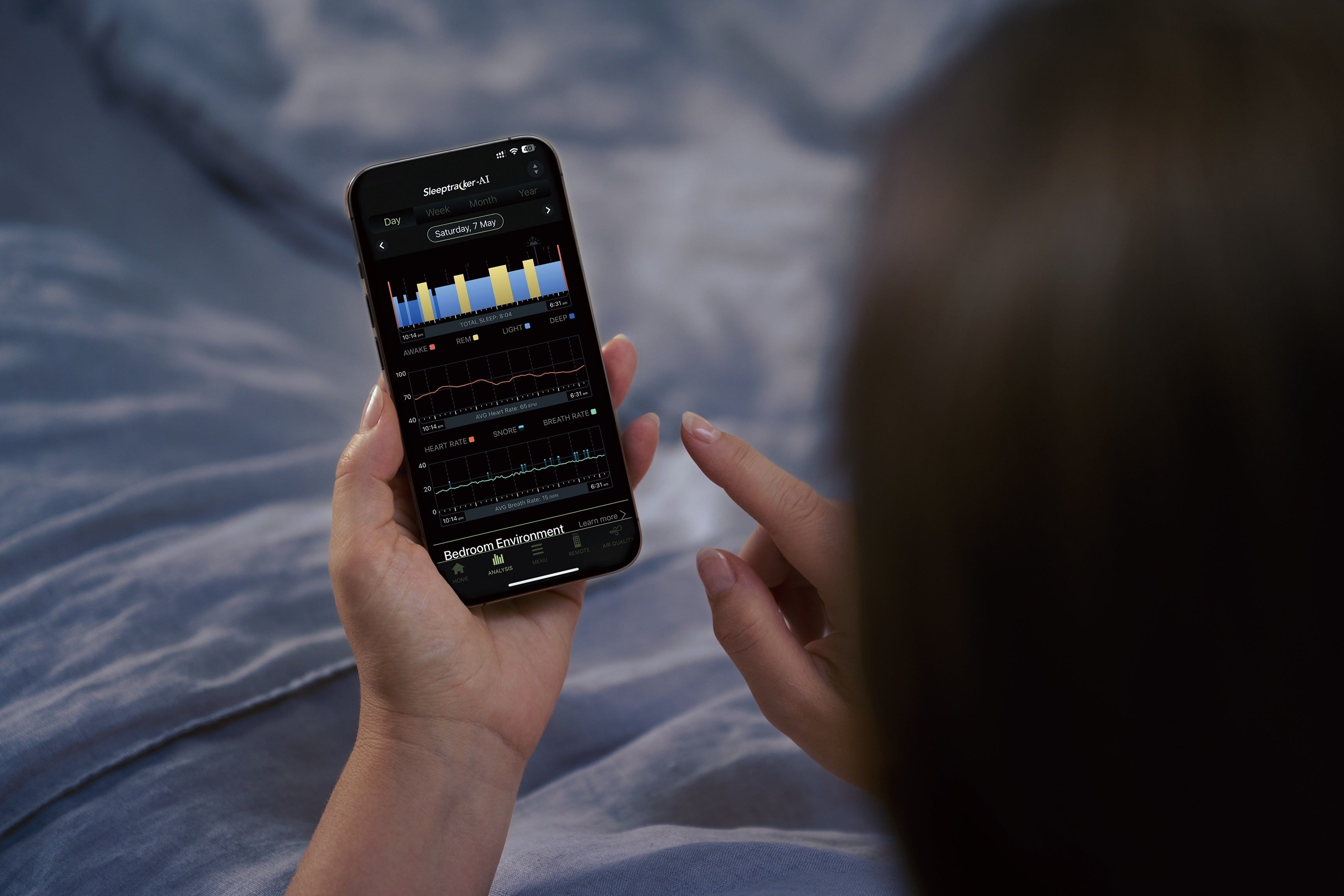 寝室環境インサイト:ベッド付近の温度、湿度、空気清浄度、二酸化炭素濃度が表示され、それぞれの測定値をグラフでレポート。寝室の温度や湿度を管理し眠りの質を向上できます。