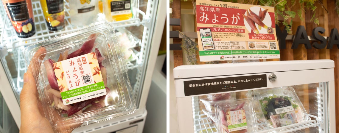 今回はJA高知グループ様と、高知県産みょうがのプロモーションを実施いたしました。みょうがをピクルスにしてカップに入れ、OFFICE DE YASAI の売り場において無料サンプリングいたしました。