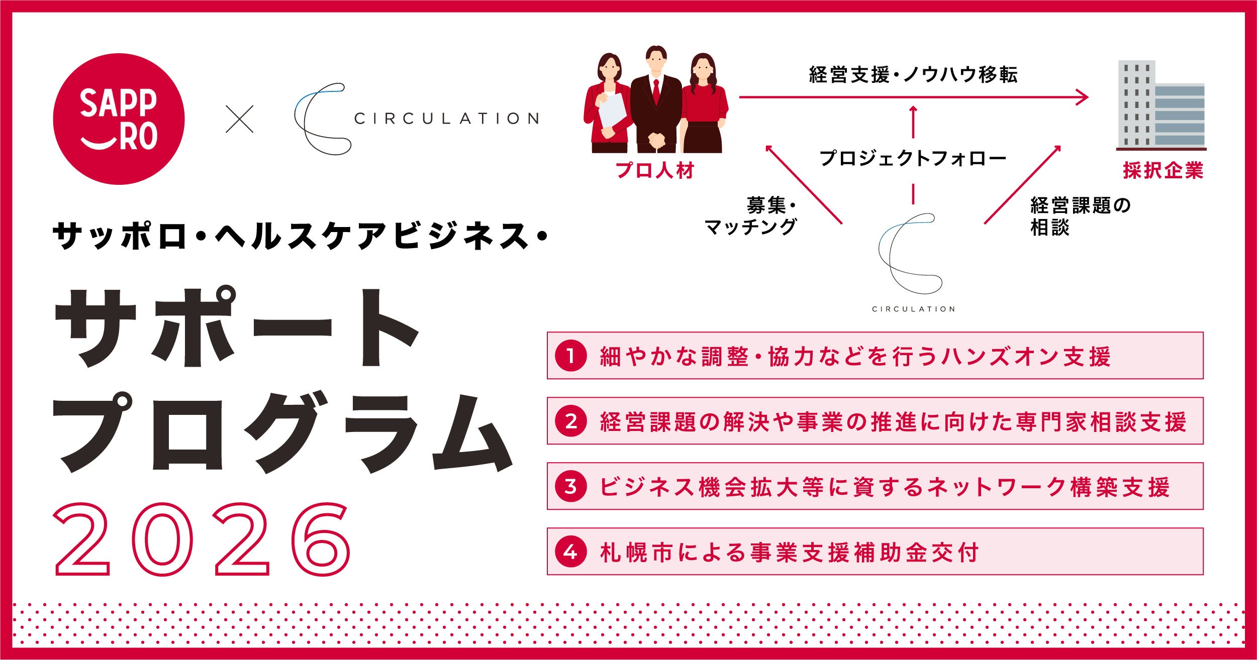 30,000名以上のプロ人材の経験・知見を複数の企業でシェアし、経営課題を解決するプロシェアリング事業を運営する株式会社サーキュレーション(所在地:東京都渋谷区、代表取締役社長:福田 悠、以下サーキュレーション)は、札幌市経済観光局より、ヘルスケア関連企業の事業化支援を目的とした「サッポロ・ヘルスケアビジネス・サポートプログラム2026」運営業務(以下、本事業)を受託しました。これにより、北海道支社を中心に、首都圏等のプロフェッショナル人材と市内企業との共創を生み出し、札幌市の重点分野であるヘルスケア産業の成長を強力に支援します。