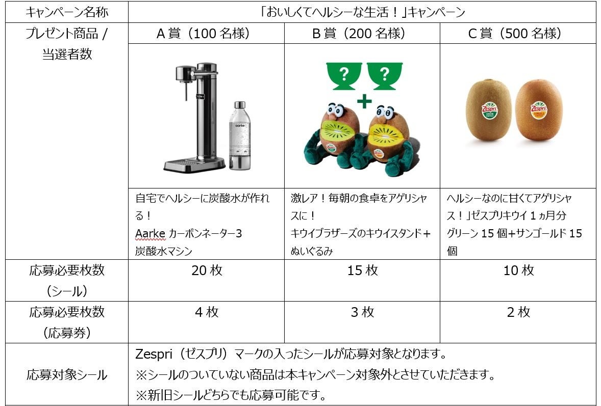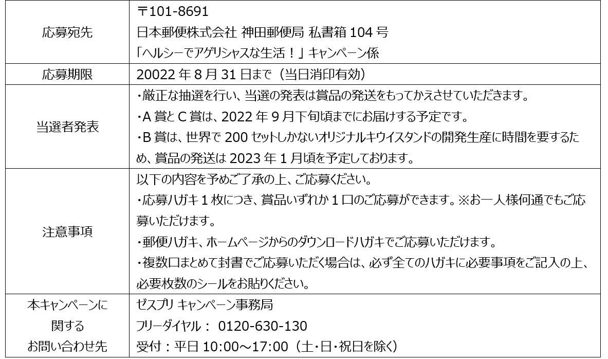 楽しみながらヘルシーな生活を続けてほしいと考えるゼスプリは、日々の生活をヘルシーでアゲリシャス*にするための賞品をご用意しました。応募の締切は、2022年8月31日(水)まで、当日消印有効です。詳しくはキャンペーンサイトをご覧ください。