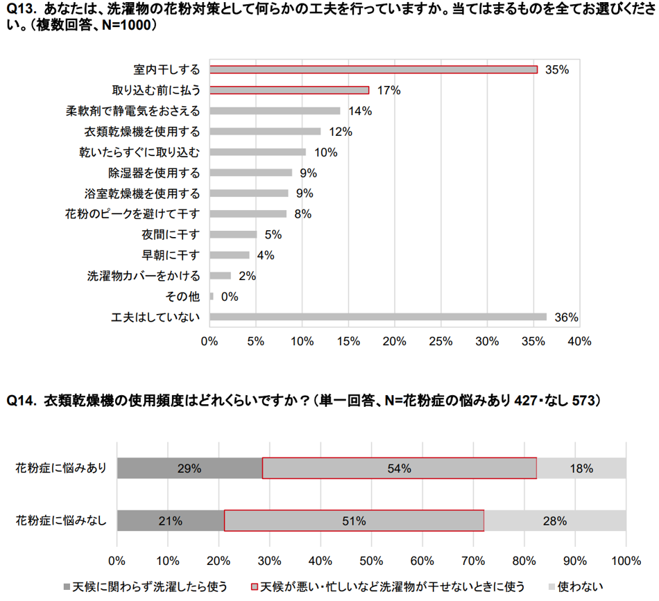 また、除湿器や乾燥機付き洗濯機など、衣類の乾燥機の使用頻度について聞いたところ、最も多い回答は「洗濯物が干せないときに使う(花粉症の悩みあり54%、なし51%)」でした。