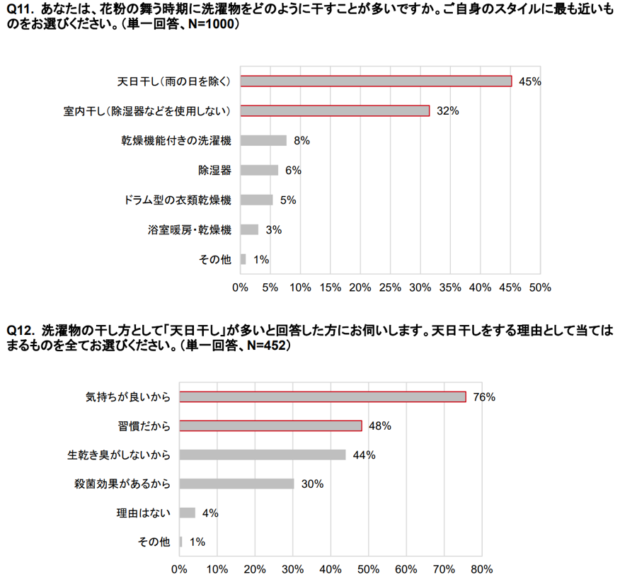 花粉の時期に悩みの種となる洗濯について聞きました。その結果、最も多い回答は「天日干し(45%)」で、次いで「室内干し(32%)」でした。また、天日干しを選ぶ理由として最も多い回答は「気持ちが良い(76%)」、次いで「習慣だから(48%)」でした。