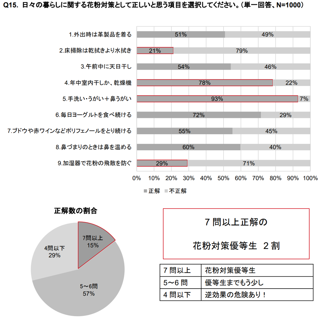 調査対象者への花粉対策○×クイズの結果、7問以上正解した「花粉対策優等生」は2割(15%)に留まりました。正解率が高い項目は「5.手洗い・うがい+鼻うがい(93%)」「4.年中室内干しか、乾燥機(78%)」、反対に低い項目は「2.床掃除は乾拭きより水拭き(21%)」「9.加湿器で花粉の飛散を防ぐ(29%)」でした。