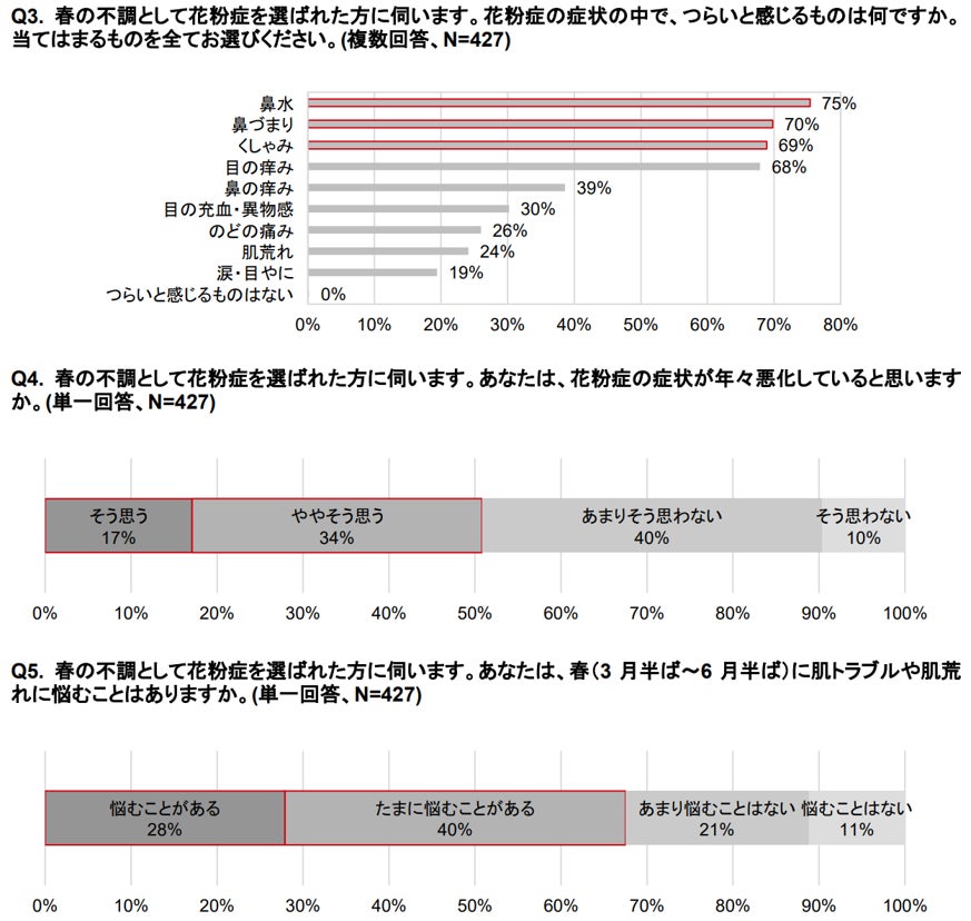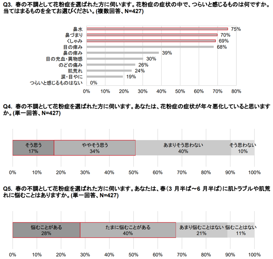 また、春には花粉症だけでなく、肌トラブルについても「悩むことがある(28%)・たまに悩むことがある(40%)」と回答しました。