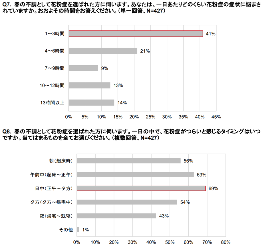 春の不調として花粉症がある方に、症状に悩まされる一日の時間を聞きました。その結果、最も多い回答は「1~3時間(41%)」でした。年間に換算すると約270時間(3時間×2~4月の日数:90日)です。また、つらいと感じるタイミングは、「日中(正午~夕方)(69%)」でした。