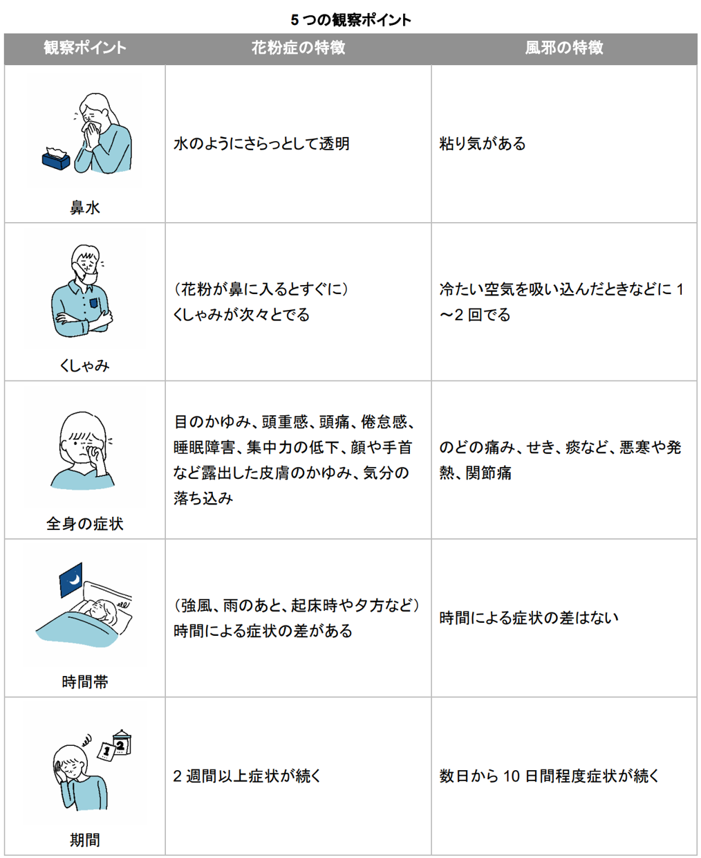 花粉症と風邪は症状が似ていることから、判断がつかない方も多いのではないでしょうか。5つの観察ポイントから花粉症と風邪を見分ける、「花粉症診断テスト」を石井先生に作成していただきました。