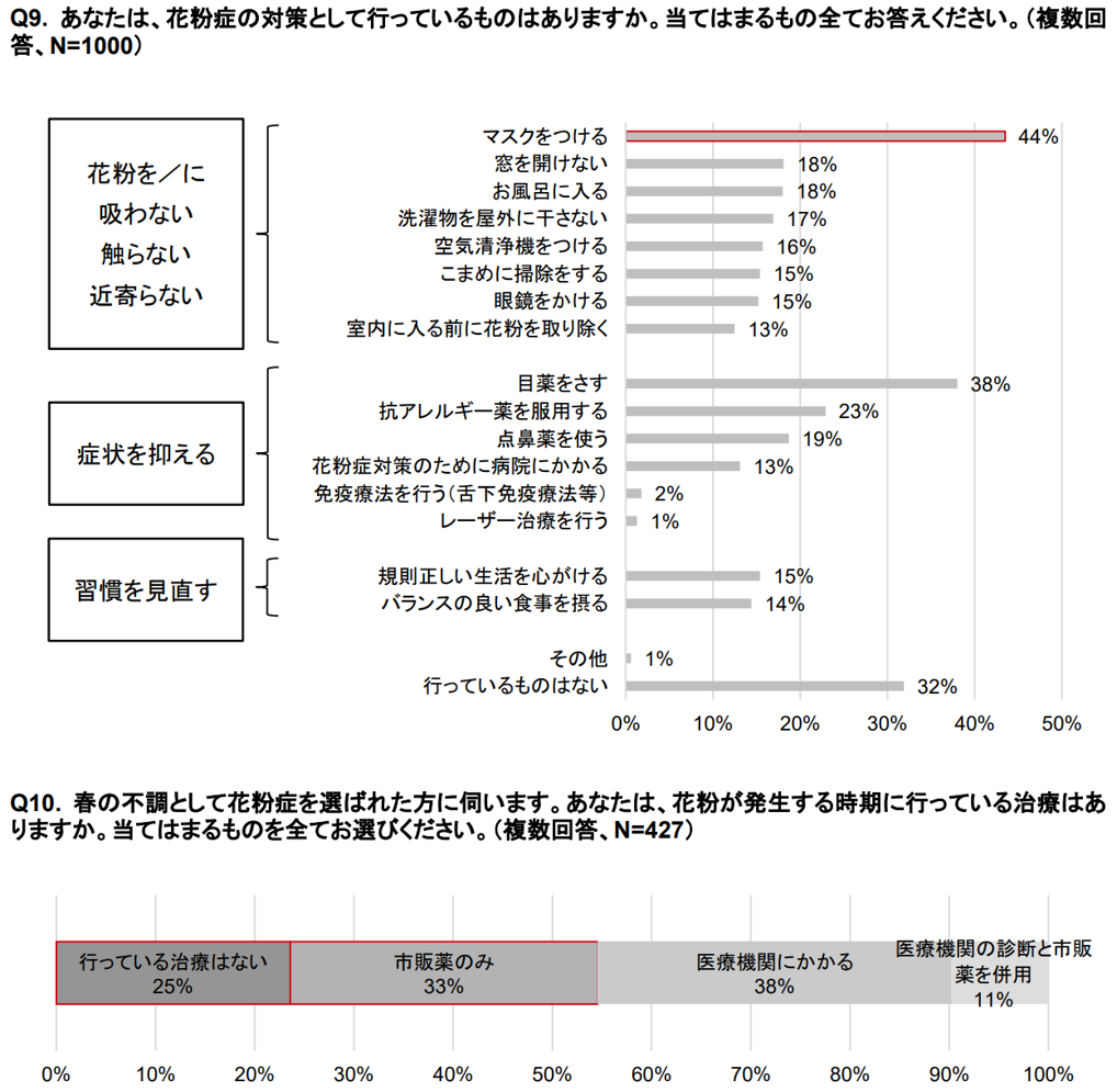 花粉症の対策を聞いたところ、最も多い回答は「マスクをつける(44%)」でした。また、花粉の時期の治療法として「行っている治療はない(25%)」「市販薬のみ(33%)」と、半数以上が医療機関を受診していませんでした。