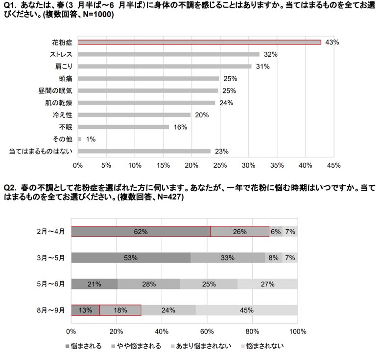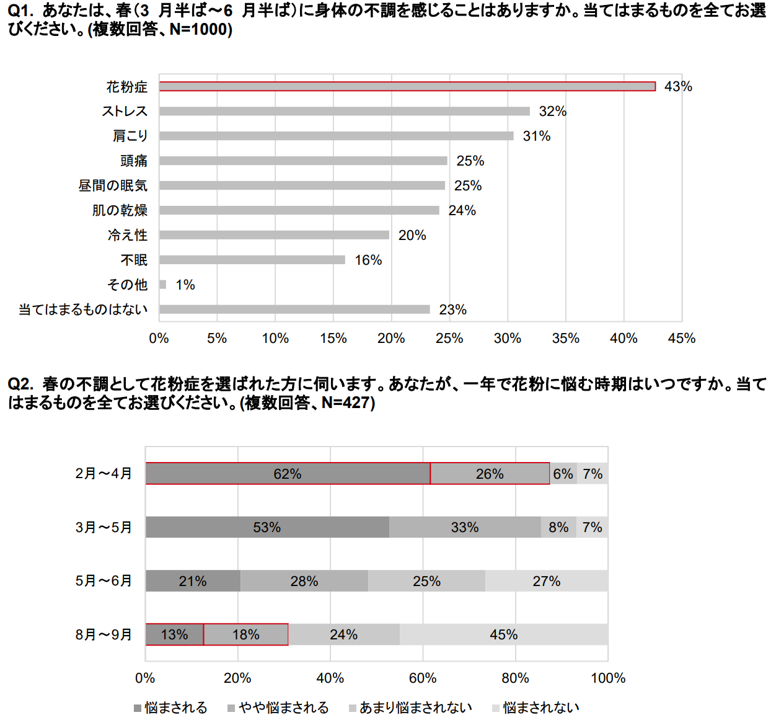 全国の1,000名に春に悩む身体の不調を聞きました。その結果、最も多い回答は「花粉症(43%)」でした。そのうち、花粉に悩む時期については「2月~4月(88%)」が最も多い一方で、「8~9月(31%)」についても一定の回答がありました。