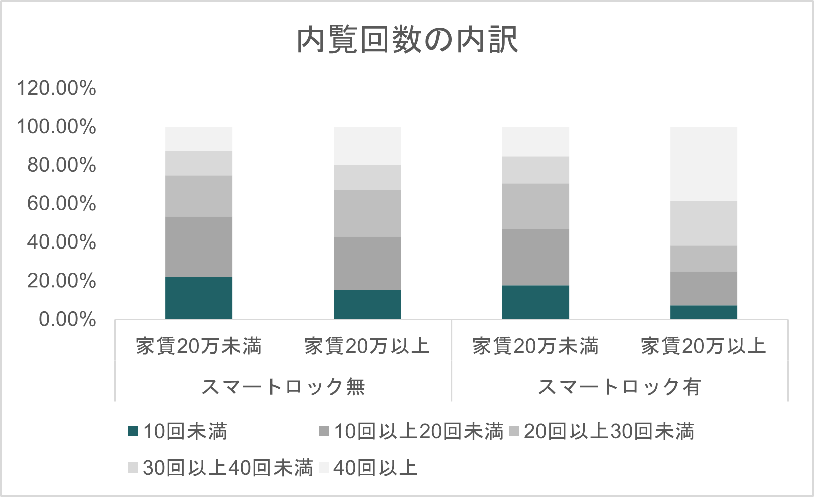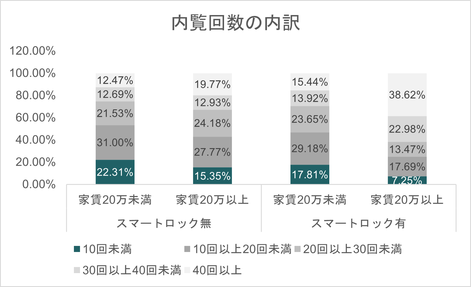 これを内覧数別で集計すると、賃料20万円以上の物件では、内覧数10回未満の割合が大幅に減少していることが分かりました。契約に至るためには、物件ごとの成約率に応じた最低限の内覧数(成約率の逆数で算出。成約率25%の場合は4回)を確保することが求められますので、10回未満の割合が大幅に減少していることは不動産オーナー目線で見ても好ましい結果であると言えます。