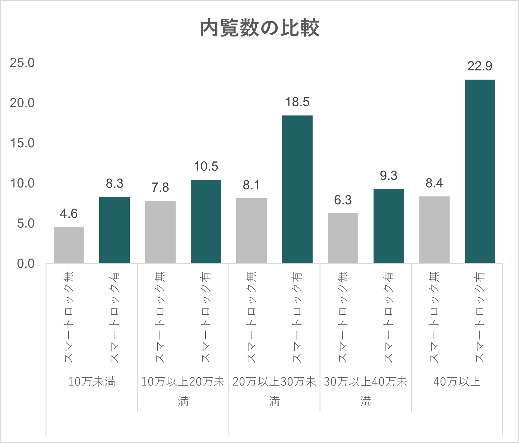 賃料帯別に見ると、賃料が上がるほど内覧回数が増加する傾向にあります。これは、内覧のハードルが下がったことで、仲介手数料の高い高賃料帯への案内機会が増えたと推察することができます。つまり、これまでは鍵の管理方法がハードルとなり、内覧候補から外されていた可能性が考えられることになります。